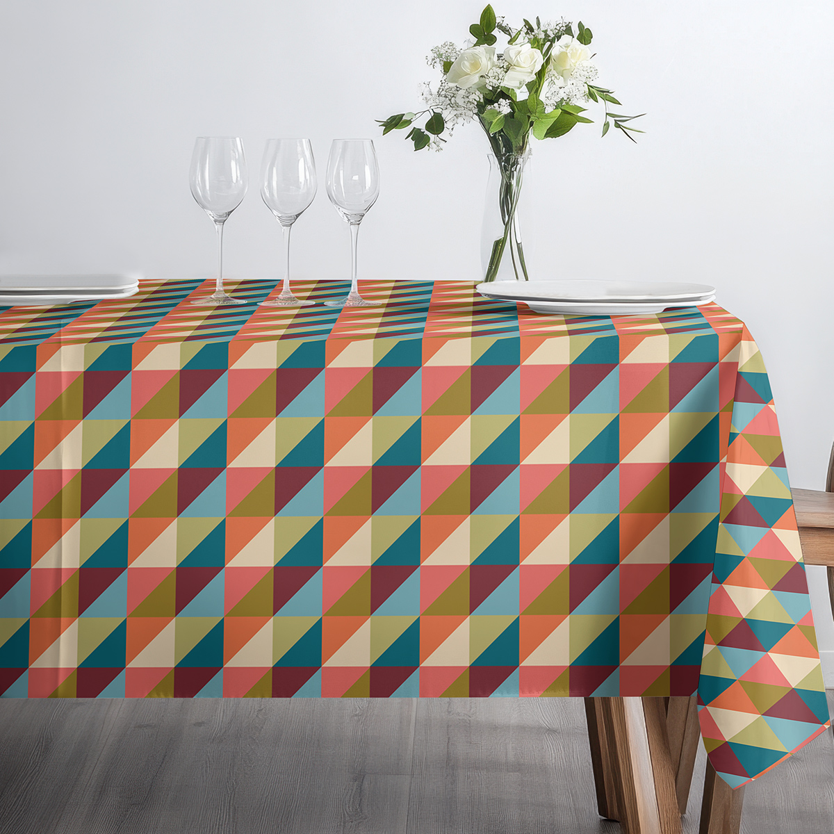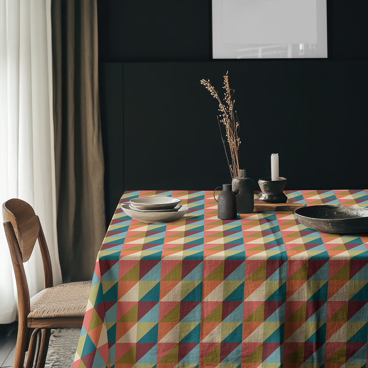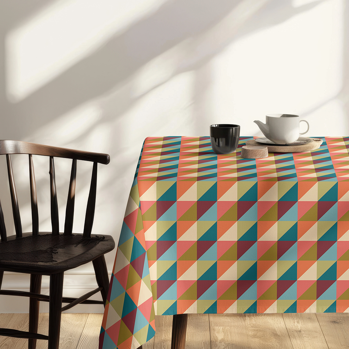 Żywy obrus z geometrycznym wzorem doda charakteru każdemu stołowi. Kolorowa mozaika trójkątów w ciepłych odcieniach świetnie sprawdzi się zarówno na co dzień, jak i podczas spotkań z bliskimi.