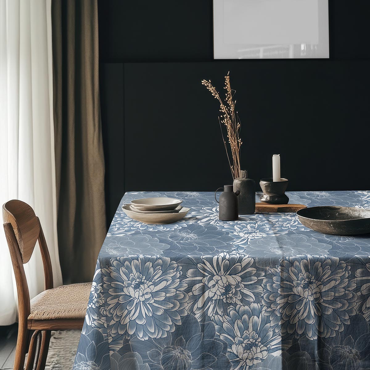 Obrus na wymiar – delikatne chryzantemy w odcieniach niebieskiego