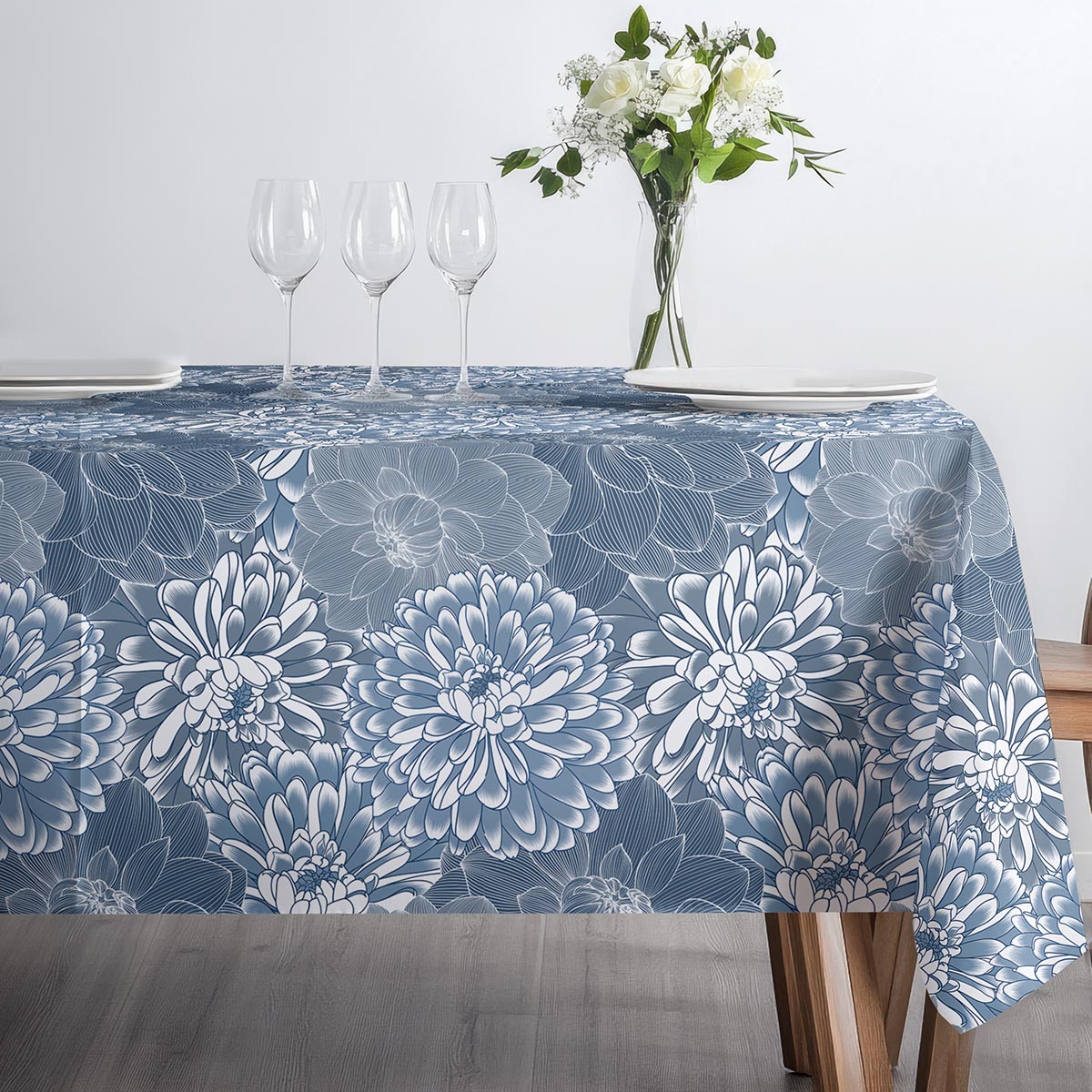 Ten obrus przyciąga wzrok gęstym, roślinnym wzorem chryzantem utrzymanych w stonowanych błękitach i bieli. Rysunkowe detale płatków nadają całości lekkości, a jednocześnie podkreślają elegancki charakter dekoracji stołu.