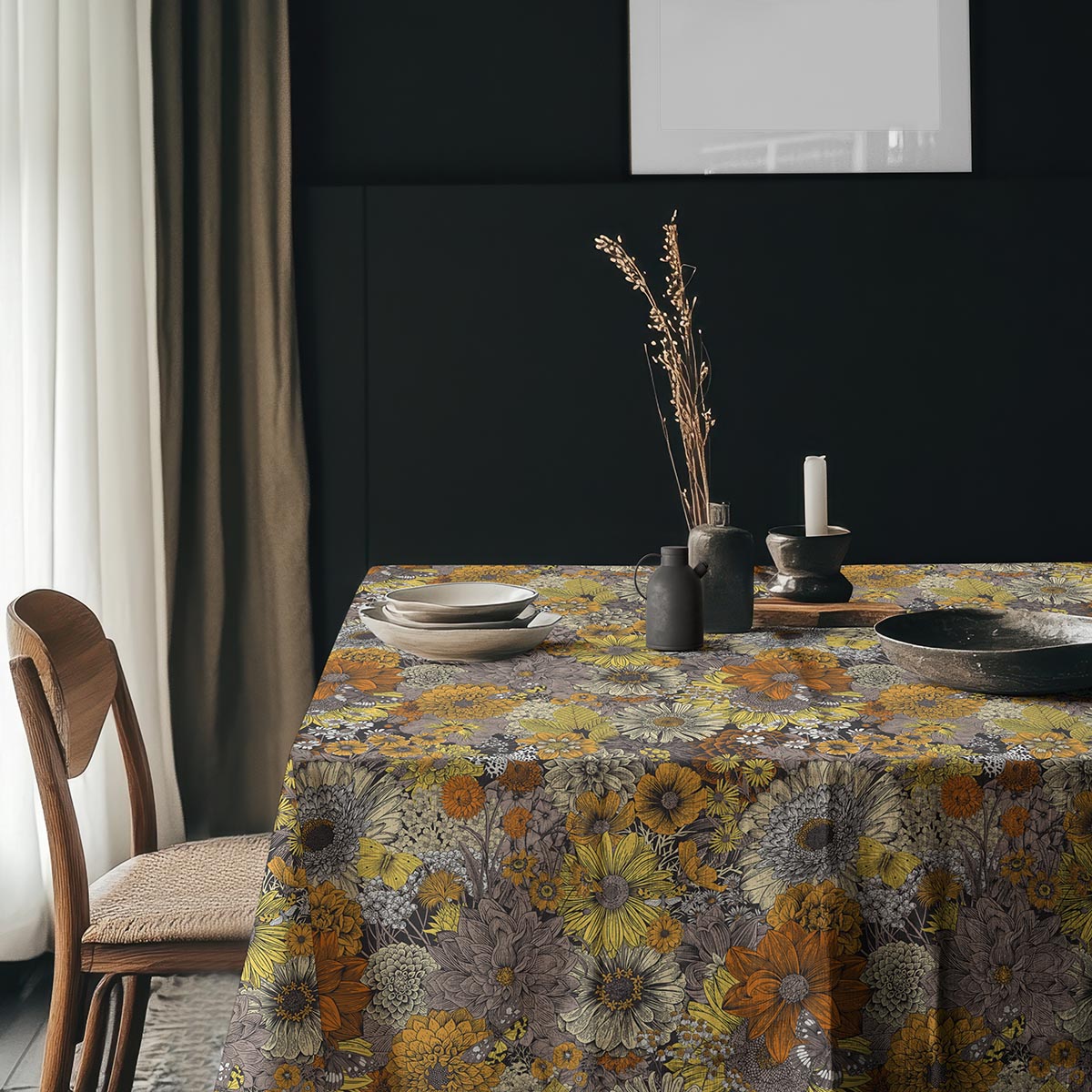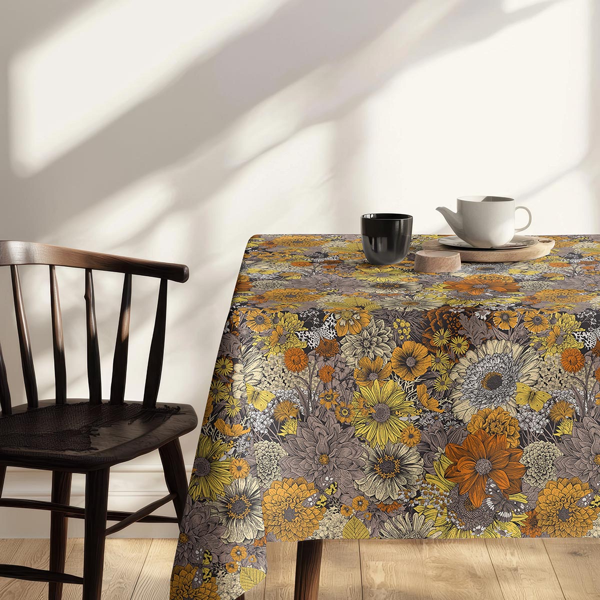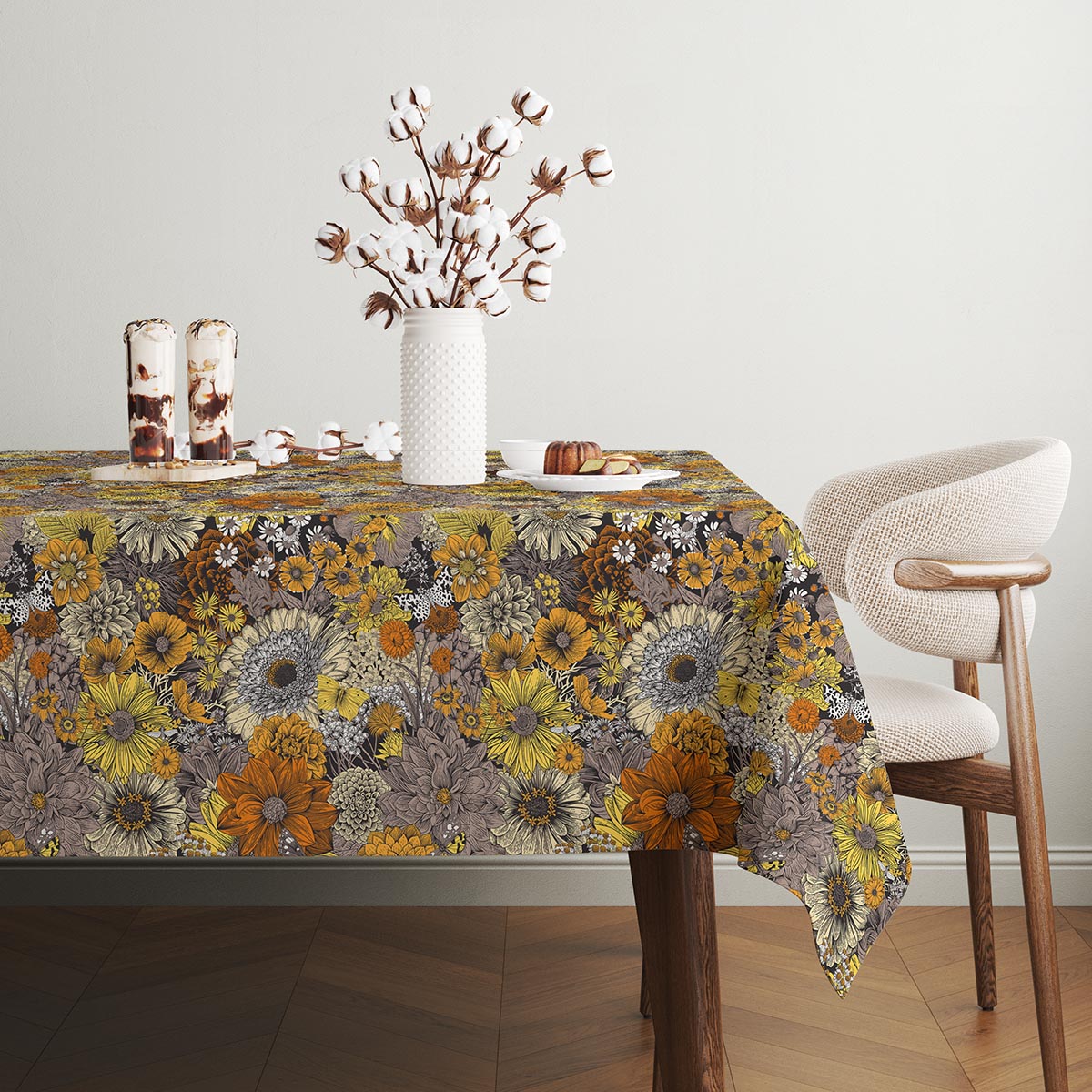 Gęsty, dekoracyjny obrus z motywem rozmaitych kwiatów w ciepłej, ziemistej palecie barw. Świetnie podkreśli stół podczas codziennych posiłków i rodzinnych spotkań, dodając wnętrzu przytulnego charakteru.
