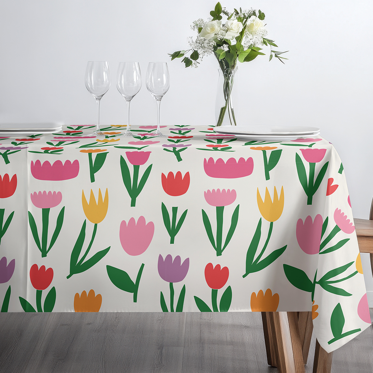 Ten obrus doda stołowi świeżości i kolorów dzięki prostym, rysunkowym tulipanom. Neutralne tło i żywe akcenty sprawdzą się zarówno na co dzień, jak i przy świątecznych spotkaniach.