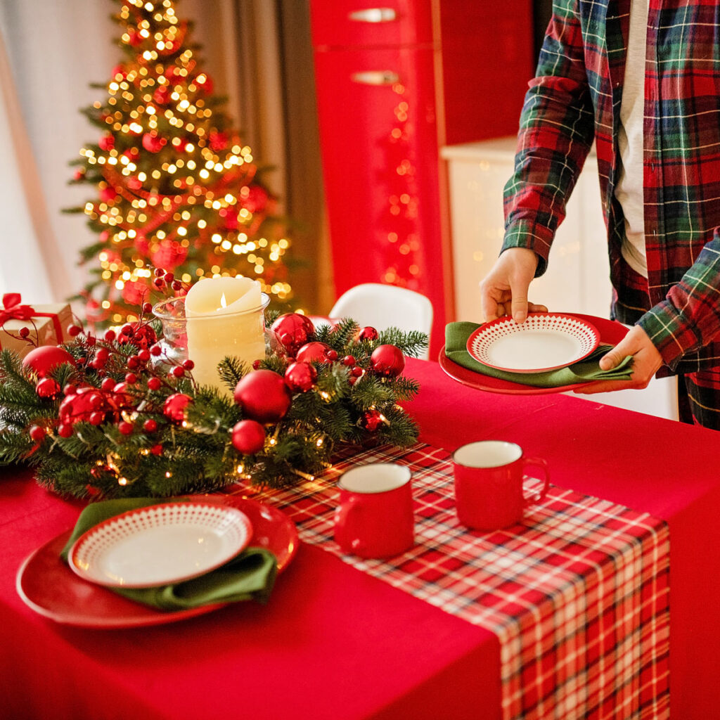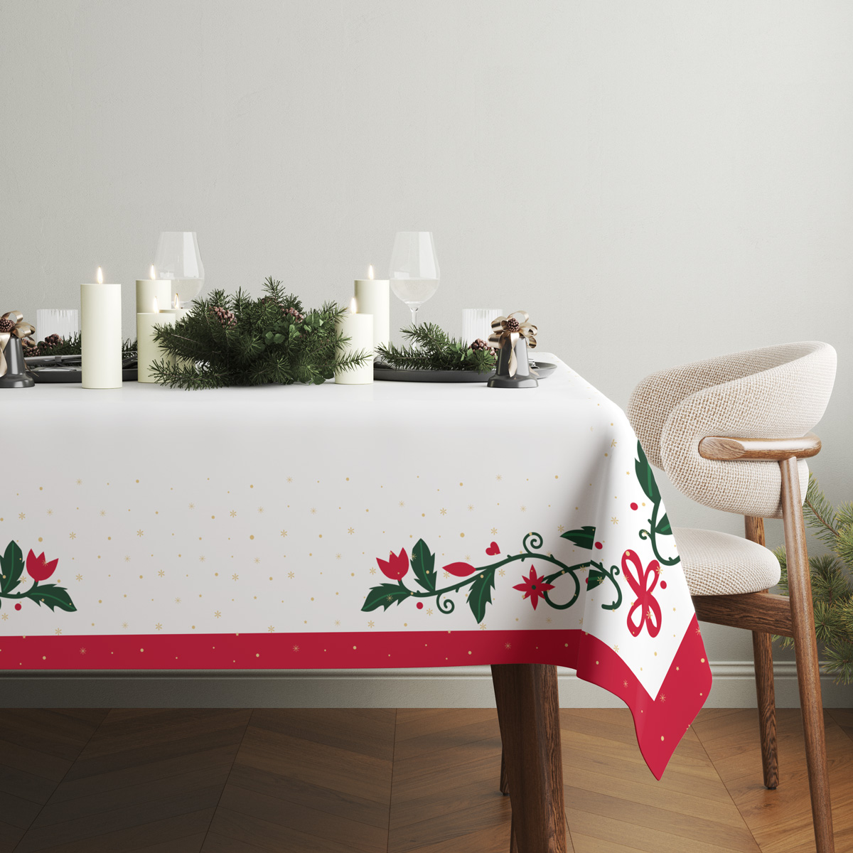 Elegancki obrus świąteczny w odcieniu bieli, ozdobiony dekoracyjnym czerwono-zielonym motywem roślinnym z delikatnymi złotymi akcentami. To klasyczna, subtelna i nastrojowa dekoracja stołu idealna na Boże Narodzenie.