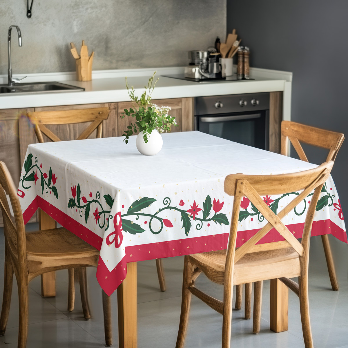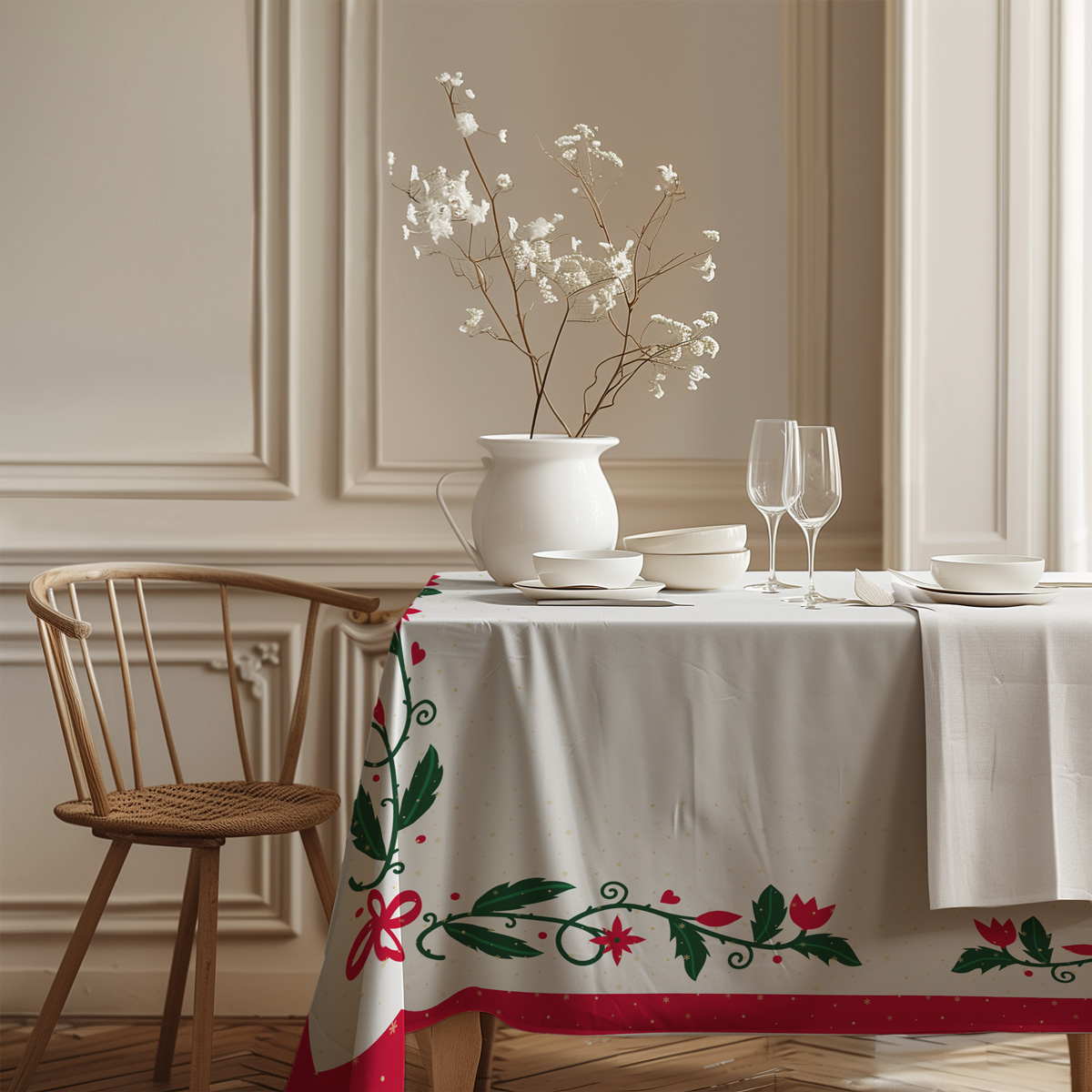 Stylowy obrus świąteczny w eleganckim, białym odcieniu, ozdobiony dekoracyjnym czerwono-zielonym wzorem roślinnym oraz drobnymi złotymi akcentami. Subtelna ornamentyka wprowadza ciepły, świąteczny klimat i pięknie podkreśla aranżację stołu.