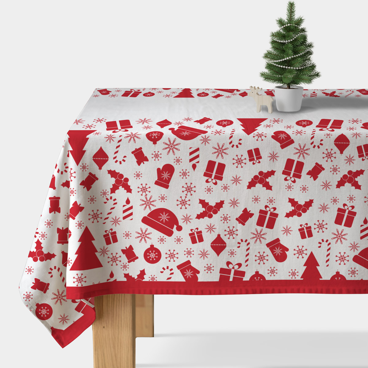 Obrus świąteczny na wymiar – biały z czerwonym wzorem świątecznych ikon