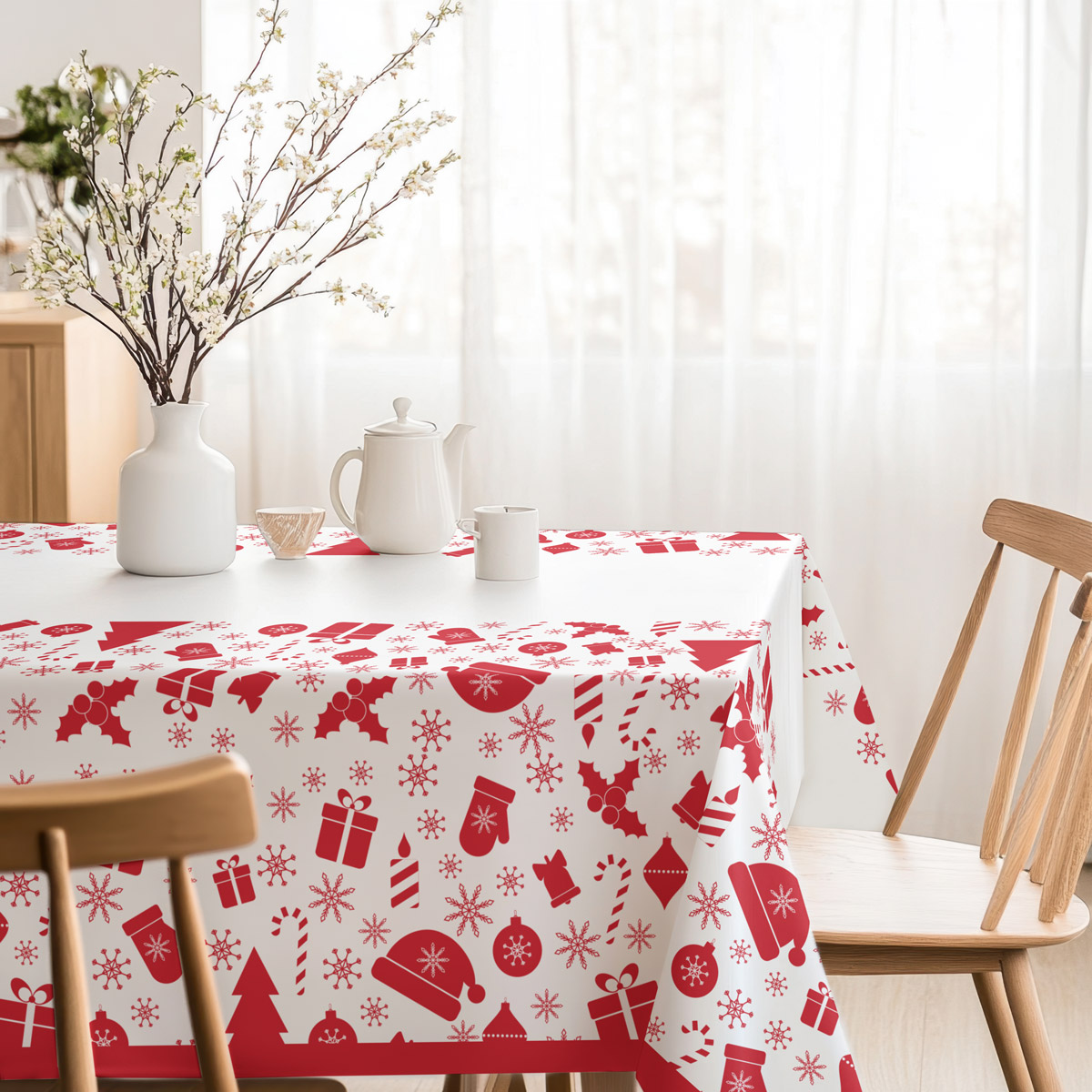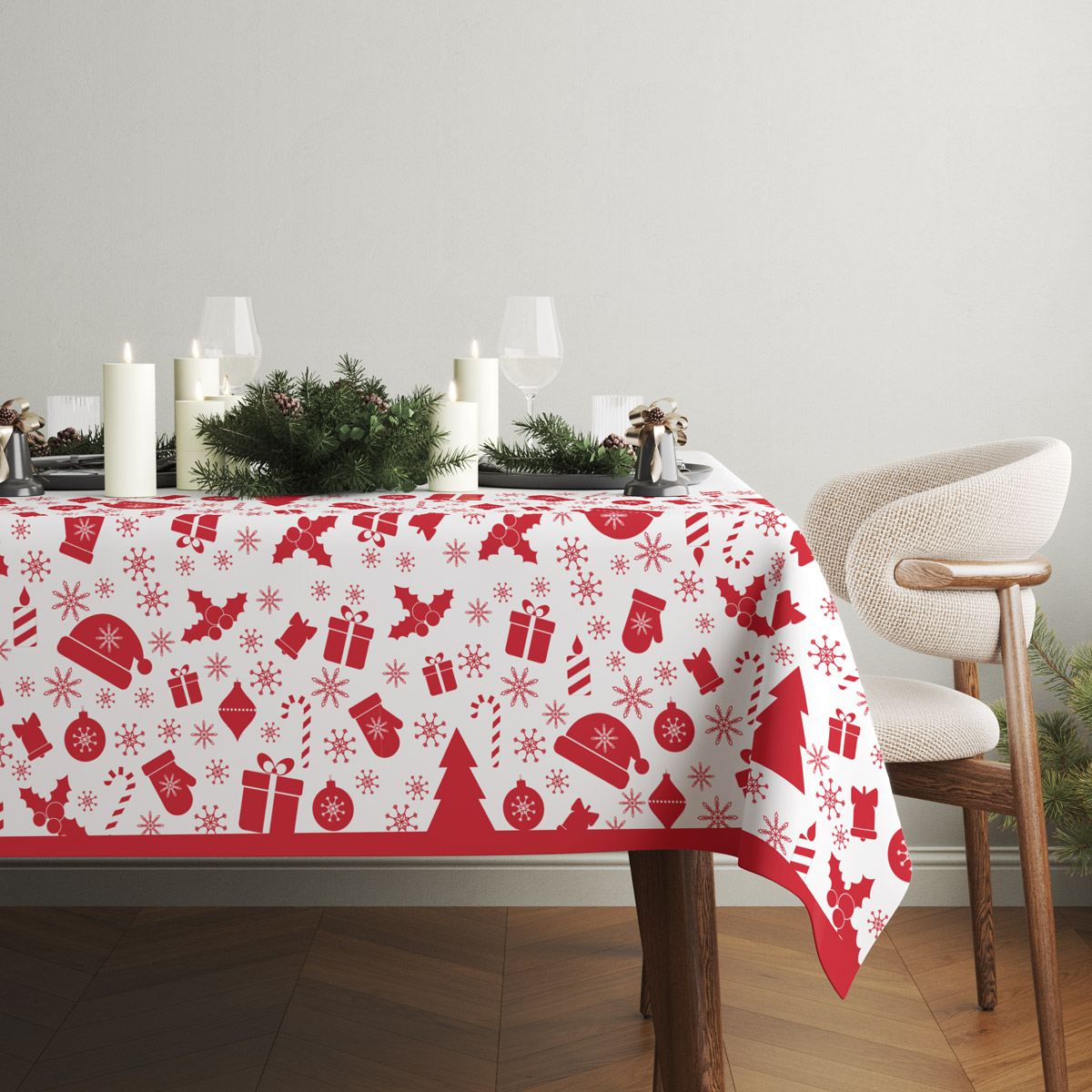Piękny obrus świąteczny w klasycznym, jasnym odcieniu bieli, ozdobiony czerwonymi ikonami nawiązującymi do zimowych dekoracji. Wzór tworzą prezenty, śnieżynki, rękawiczki, bombki, choinki oraz inne subtelne elementy, które nadają aranżacji stołu radosny i lekki charakter.