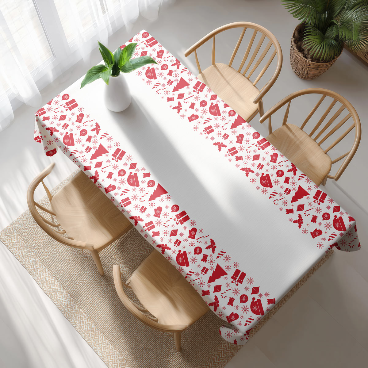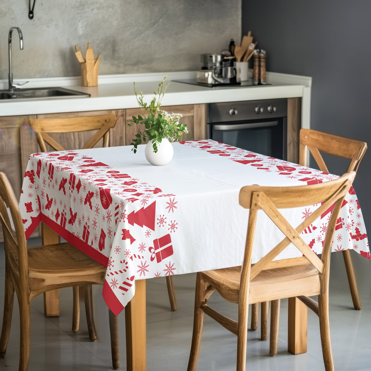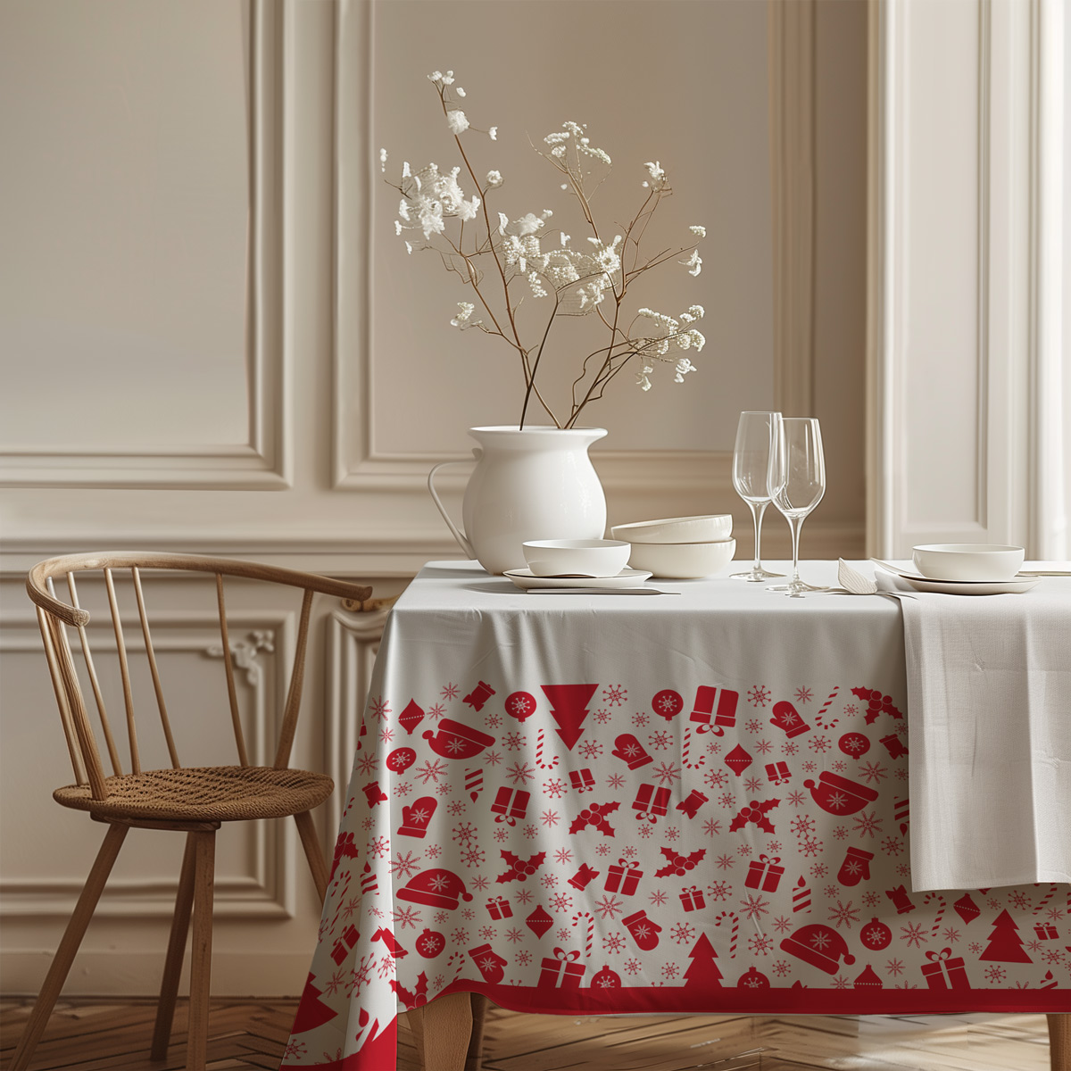Dzięki spójnej kolorystyce i starannie zaprojektowanemu rozmieszczeniu wzoru obrus świetnie prezentuje się zarówno w nowoczesnych, jak i tradycyjnych wnętrzach. Jasna tkanina optycznie rozświetla przestrzeń, a czerwone elementy podkreślają wyjątkowość świątecznych spotkań.