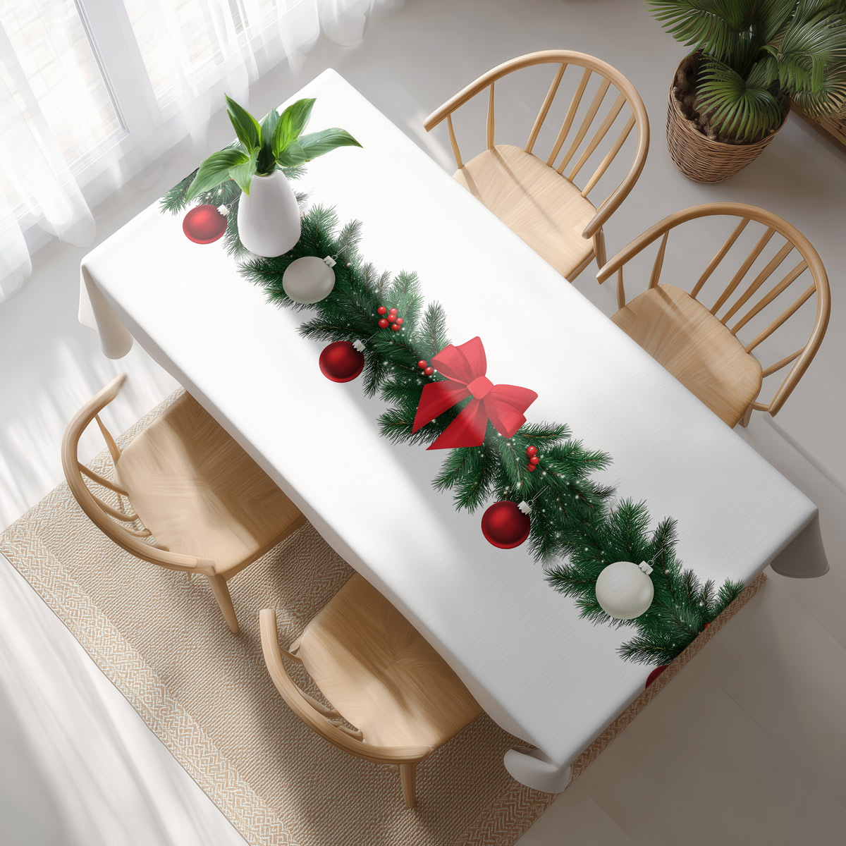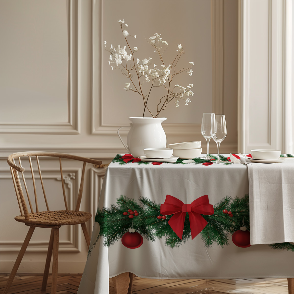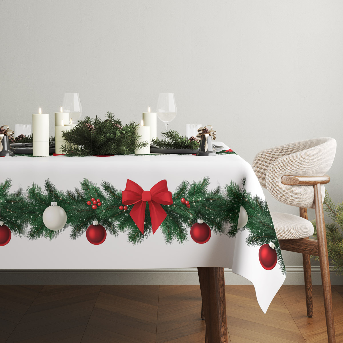 Elegancki obrus świąteczny w białym kolorze z motywem zielonej girlandy, czerwonych kokard i bombek. Idealny na bożonarodzeniowy stół, łączący tradycję z nowoczesnym stylem.