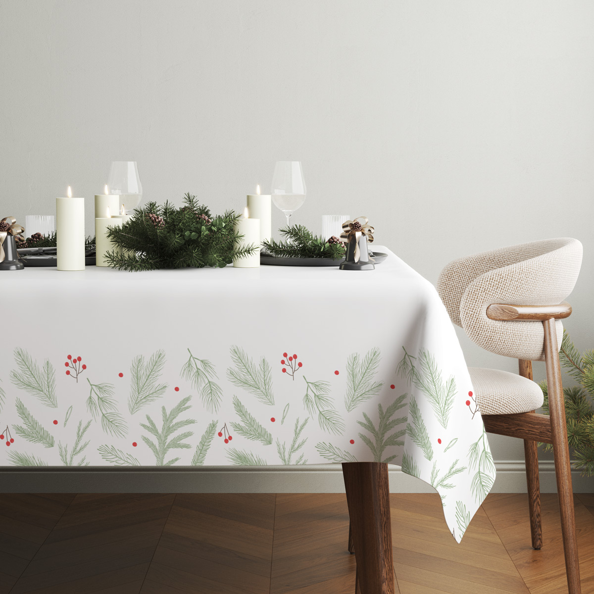 Piękny obrus świąteczny w klasycznej bieli, ozdobiony subtelnym wzorem zielonych gałązek iglastych oraz drobnymi, czerwonymi jagodami. To połączenie świeżości natury i elegancji, które doskonale sprawdzi się w każdej aranżacji świątecznego stołu.