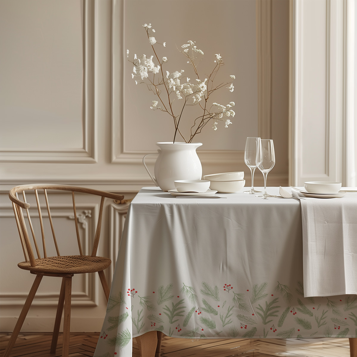 Subtelny obrus świąteczny w białym kolorze, ozdobiony delikatnym wzorem zielonych gałązek i czerwonych jagód. Naturalny i elegancki akcent, który wprowadzi do wnętrza ciepły, świąteczny klimat.