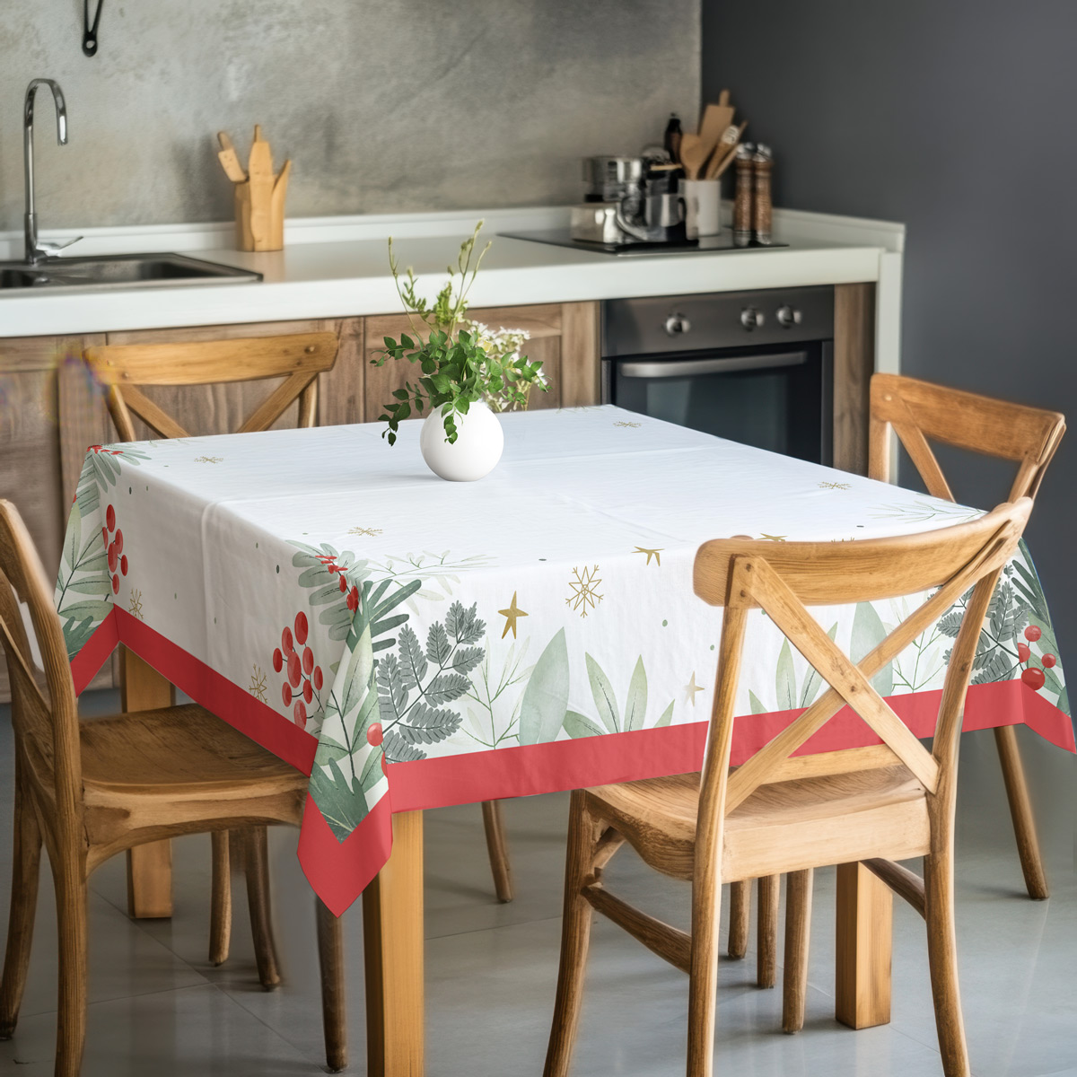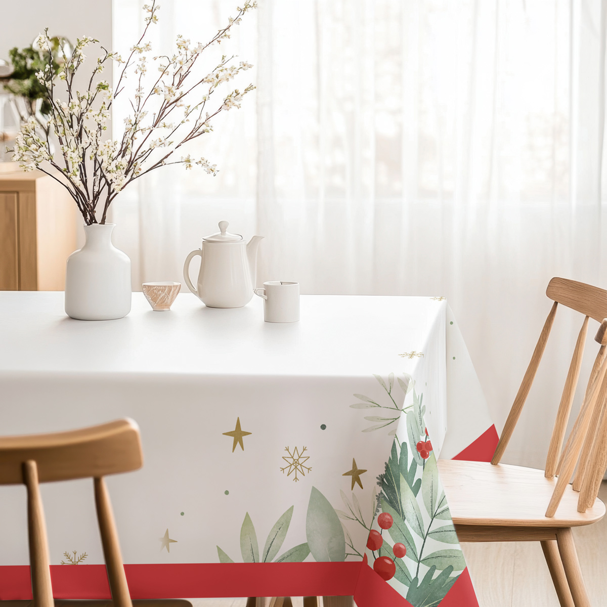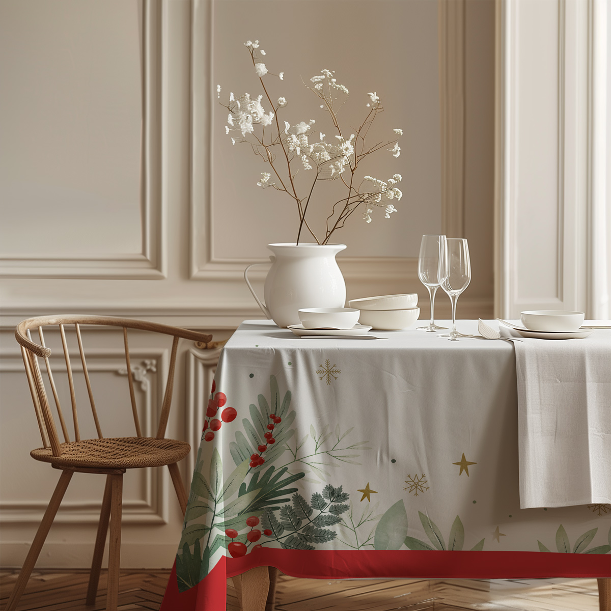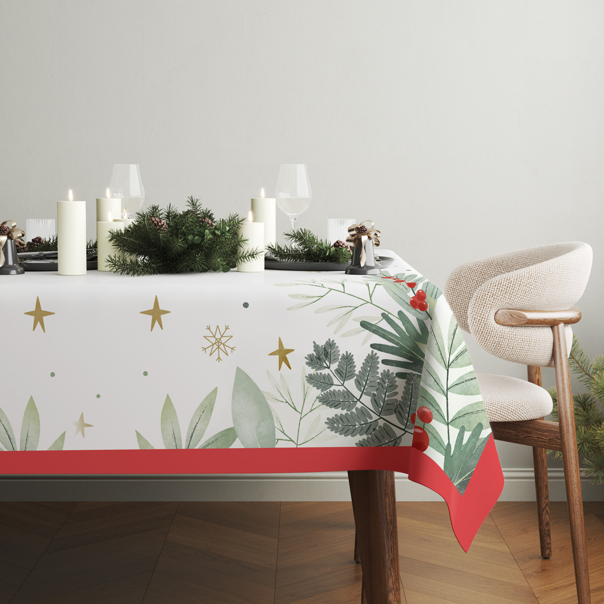 Elegancki świąteczny obrus w białym kolorze, ozdobiony subtelnym motywem zielonych gałązek, czerwonych jagód i złotych gwiazdek. Delikatny, akwarelowy wzór tworzy naturalną i nastrojową dekorację stołu na czas Bożego Narodzenia.
