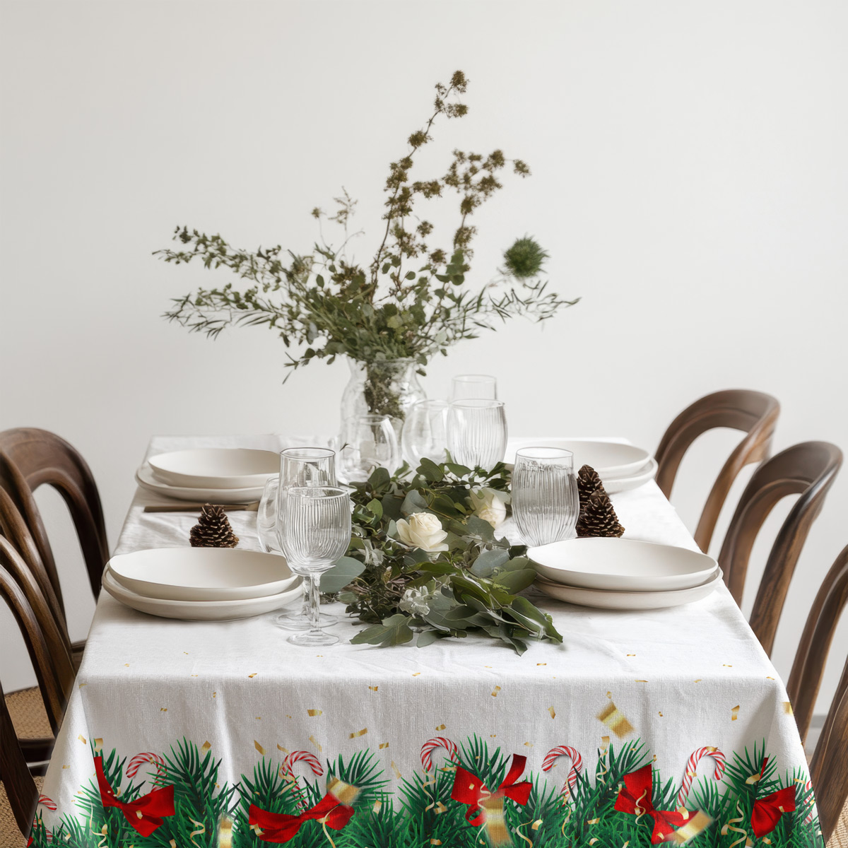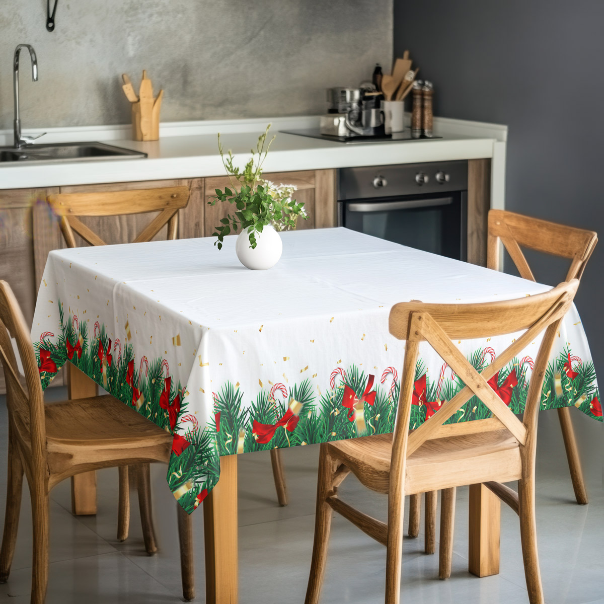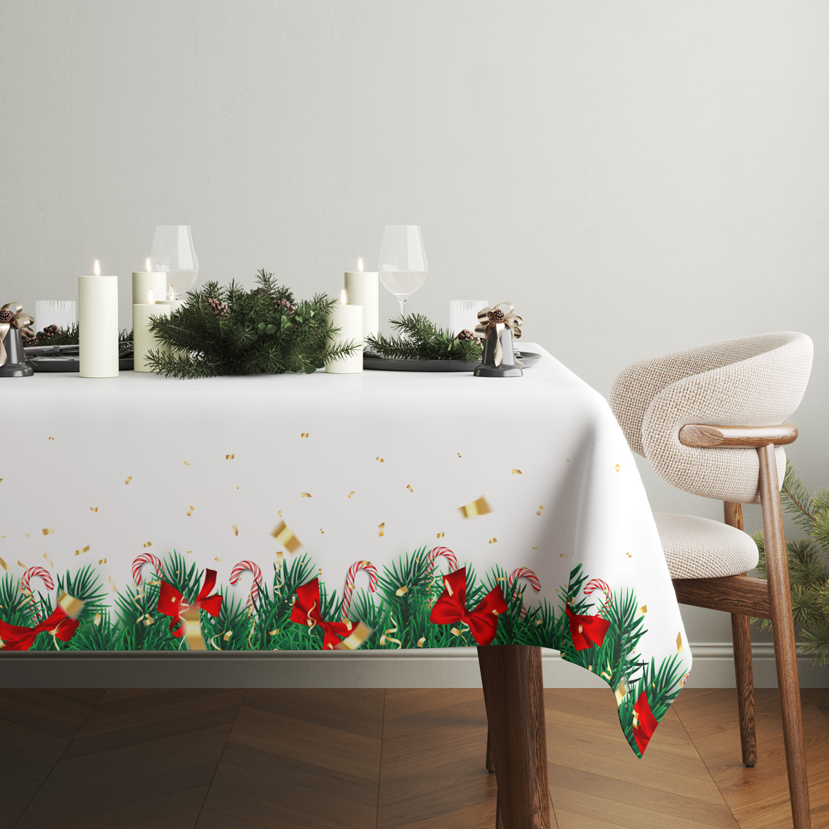 Elegancki obrus świąteczny w białym kolorze, ozdobiony wzorem zielonych gałązek świerku, czerwonych kokard, lasek cukrowych oraz złotych konfetti. Idealna dekoracja stołu, która wprowadzi radosny, bożonarodzeniowy klimat do każdej kuchni lub jadalni.