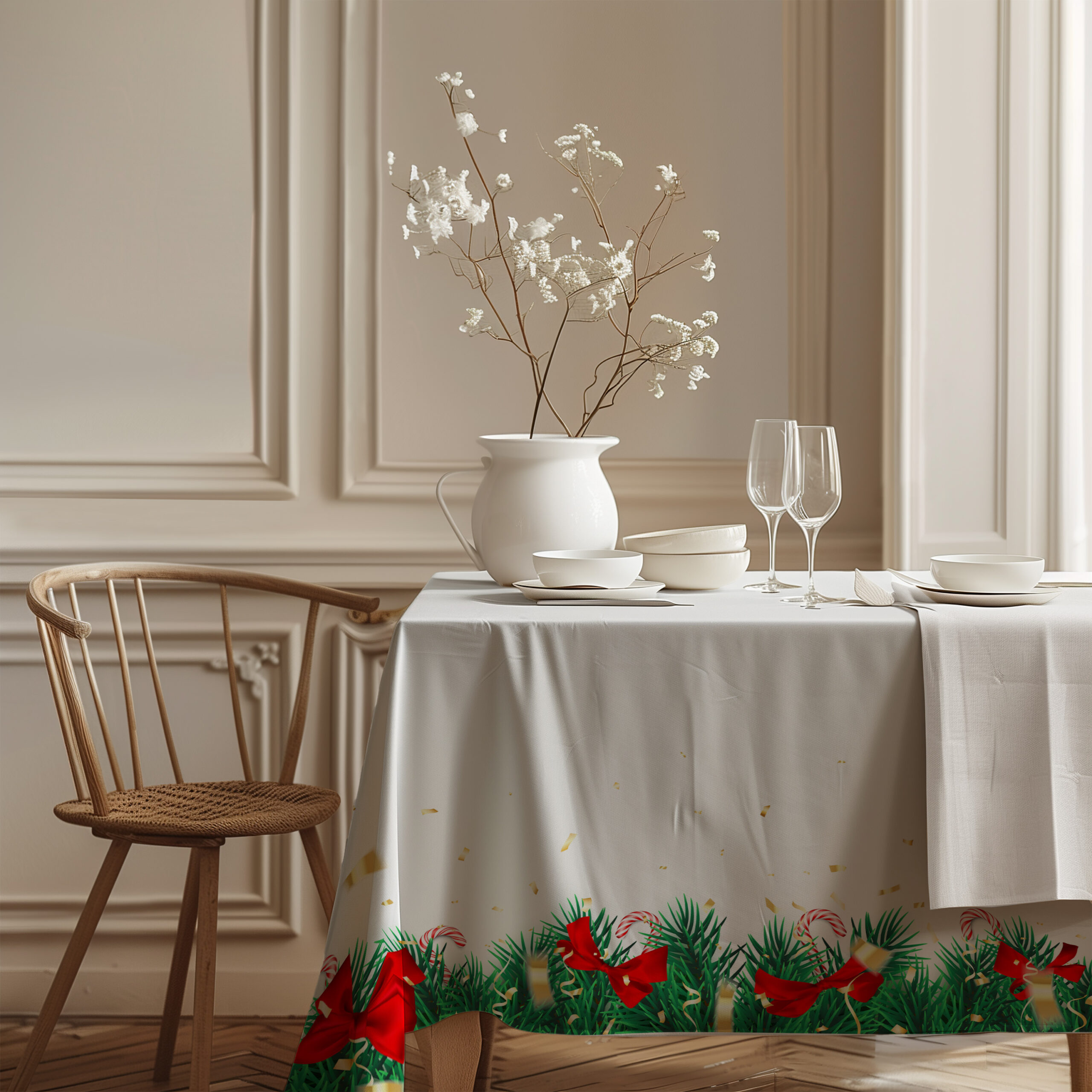 Stylowy obrus świąteczny w klasycznym białym odcieniu, udekorowany bogatym wzorem zielonych gałązek świerku, czerwonych kokard, lasek cukrowych oraz subtelnych złotych konfetti. To wyjątkowe połączenie kolorów, które wnosi do wnętrza ciepło, świeżość i typowo świąteczną atmosferę.