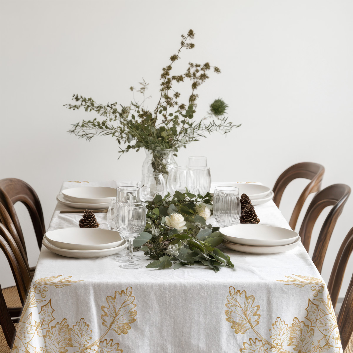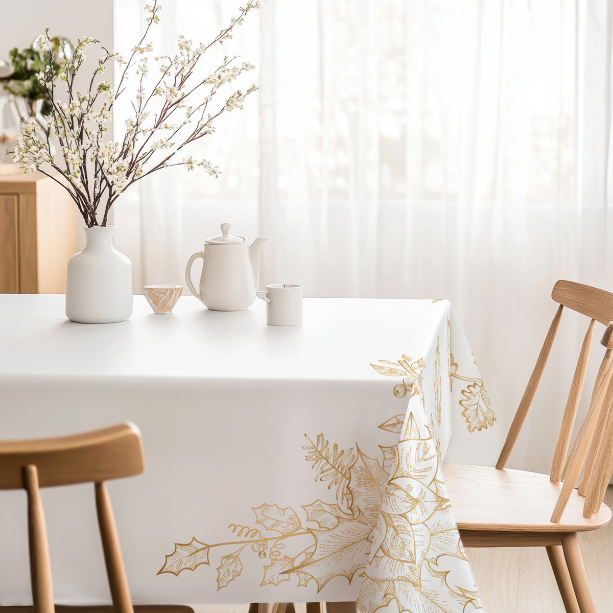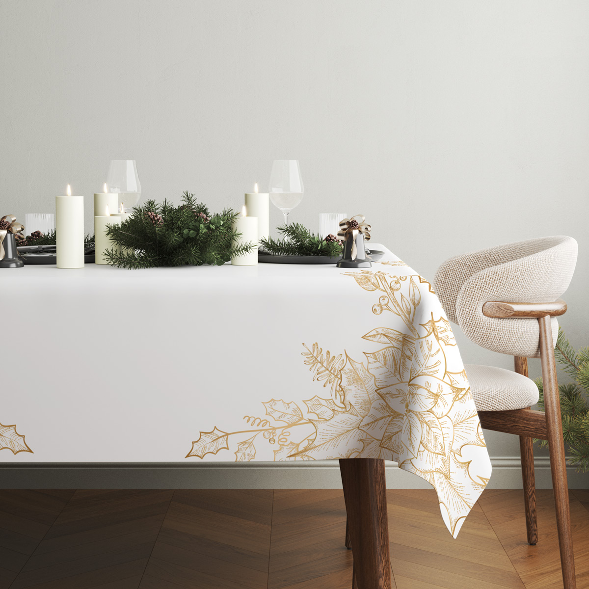 Elegancki biały obrus świąteczny ozdobiony złotym, subtelnym motywem liści, gałązek i świątecznych roślin. Klasyczna i szykowna dekoracja stołu, idealna na Boże Narodzenie i zimowe przyjęcia.
