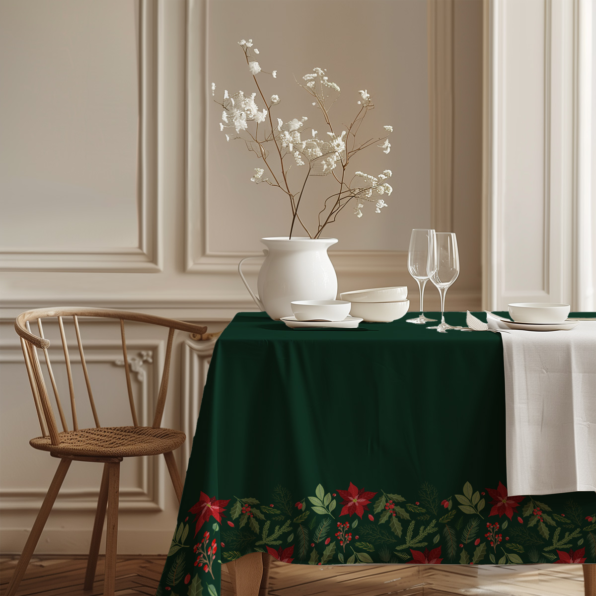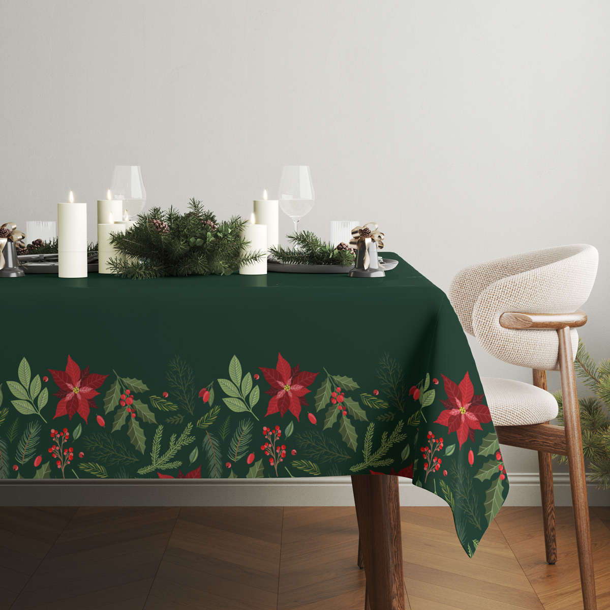 Piękny, klasyczny obrus świąteczny w głębokim odcieniu butelkowej zieleni, ozdobiony czerwonymi gwiazdami betlejemskimi, liśćmi ostrokrzewu oraz delikatnymi zielonymi gałązkami. Ten wyjątkowy wzór nawiązuje do tradycyjnych świątecznych motywów, tworząc ciepłą i elegancką atmosferę przy wigilijnym stole.