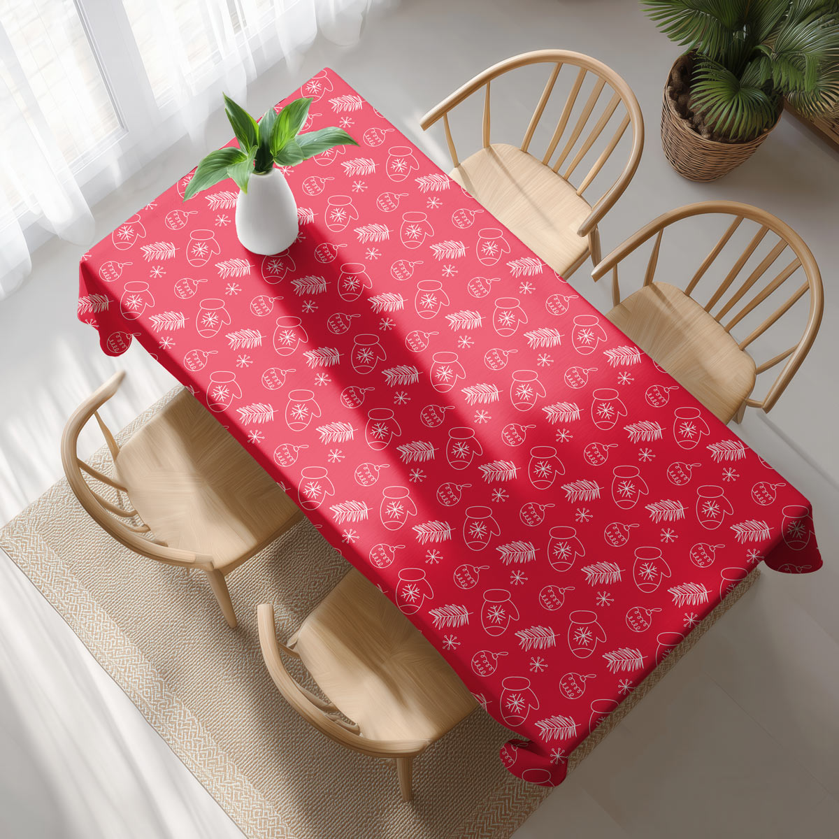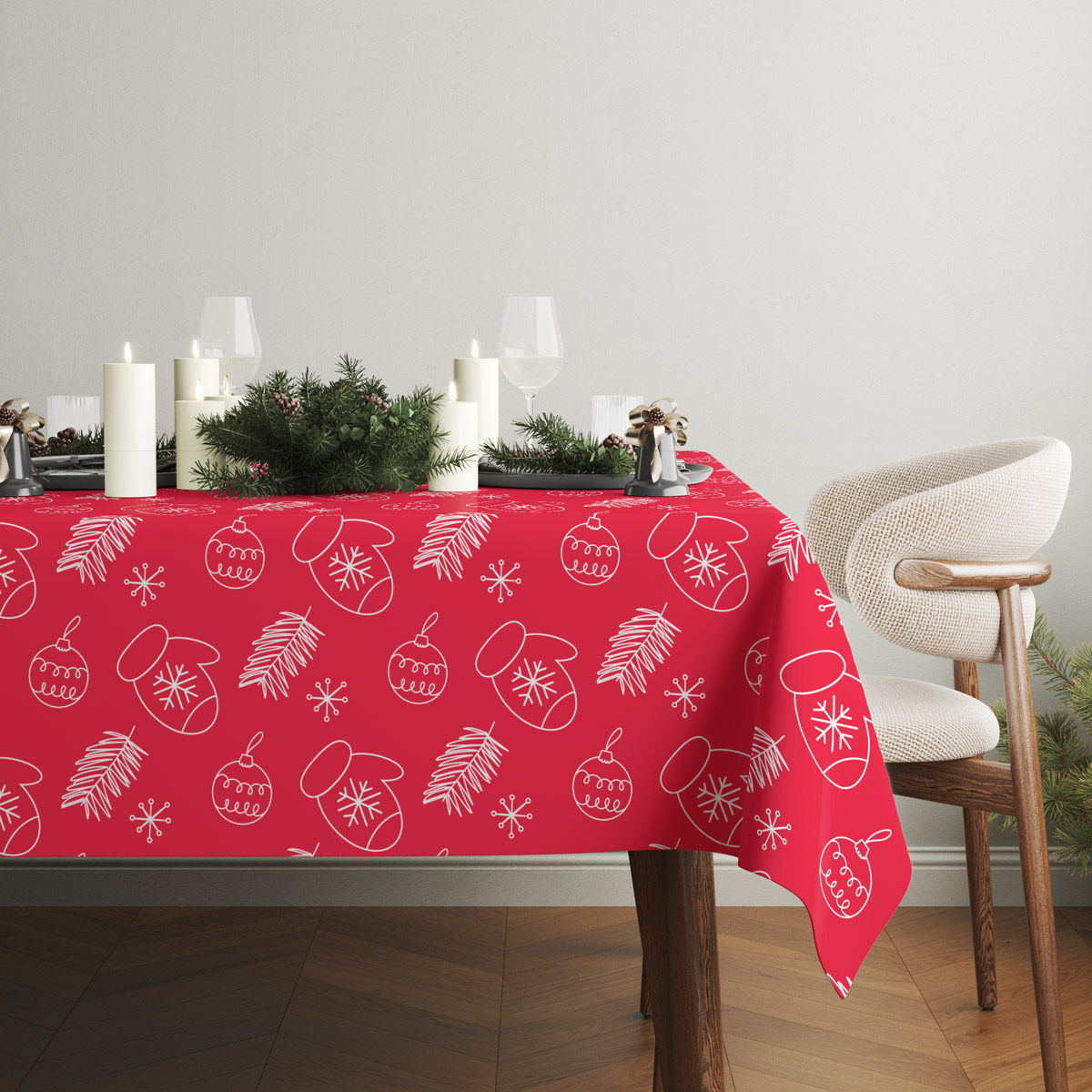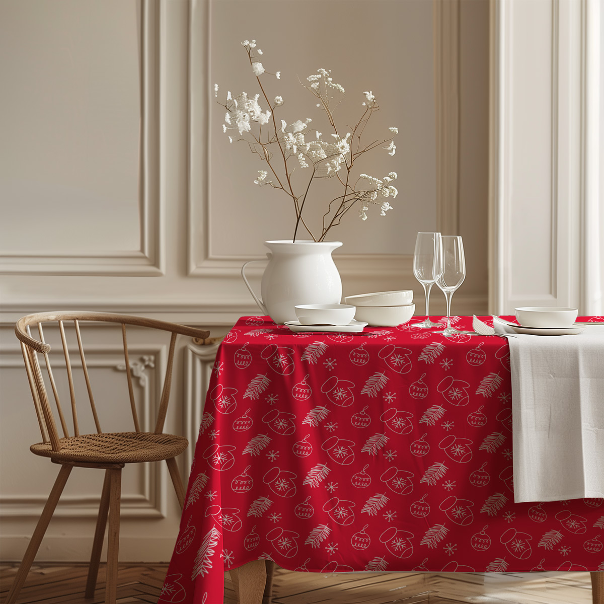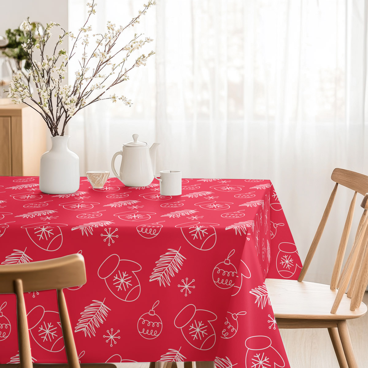 Wyrazisty czerwony obrus świąteczny ozdobiony białymi rękawiczkami, bombkami, śnieżynkami i gałązkami świerku. Radosny, klasyczny i pełen świątecznego klimatu dodatek do stołu na Boże Narodzenie.