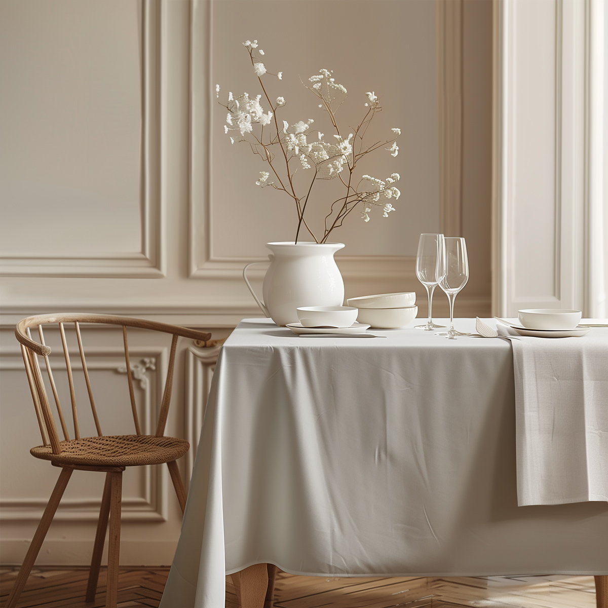Piękny gładki obrus biały, który zachwyca swoją prostotą i elegancją. Neutralna biel wnosi do wnętrza lekkość i świeżość, doskonale komponując się zarówno z klasyczną, jak i nowoczesną aranżacją stołu.