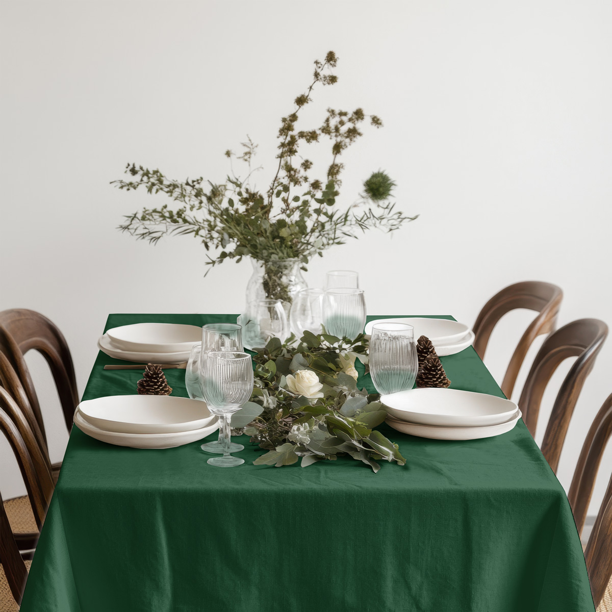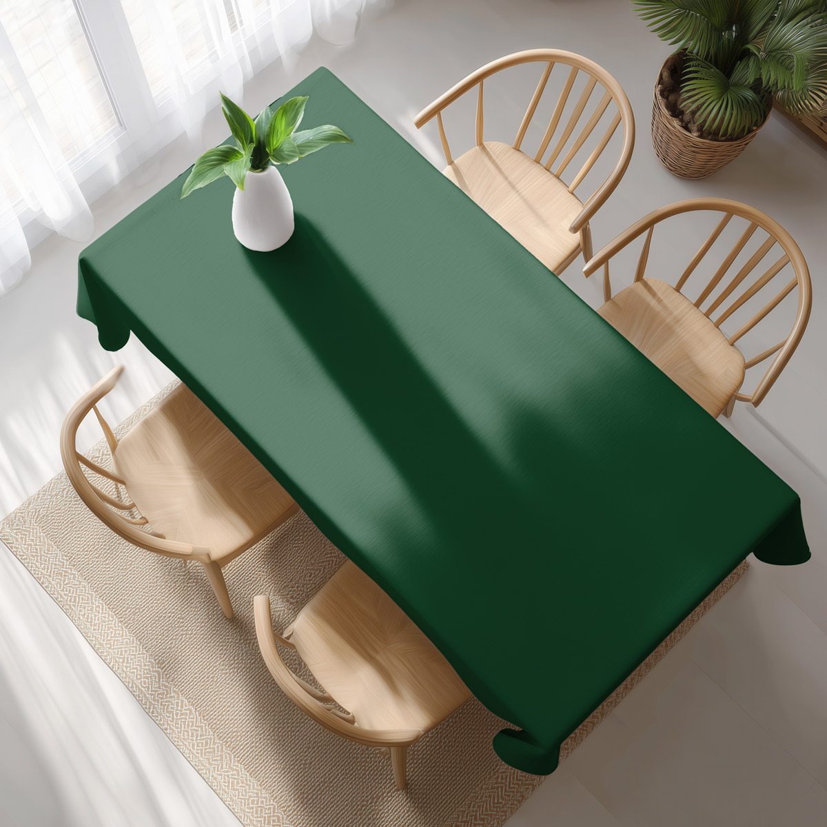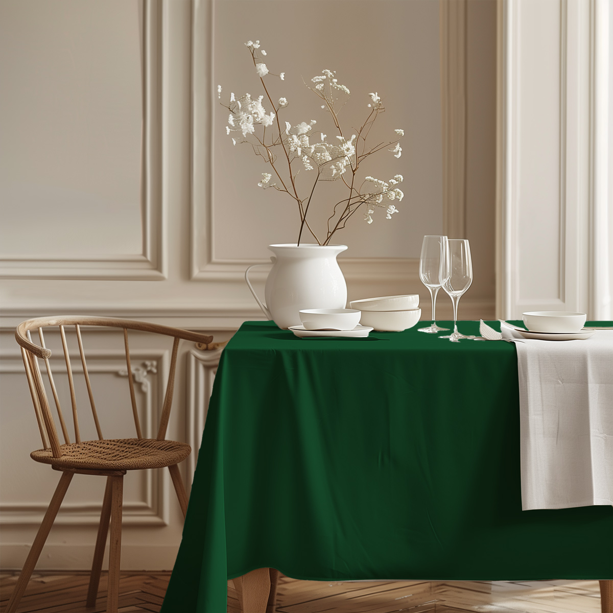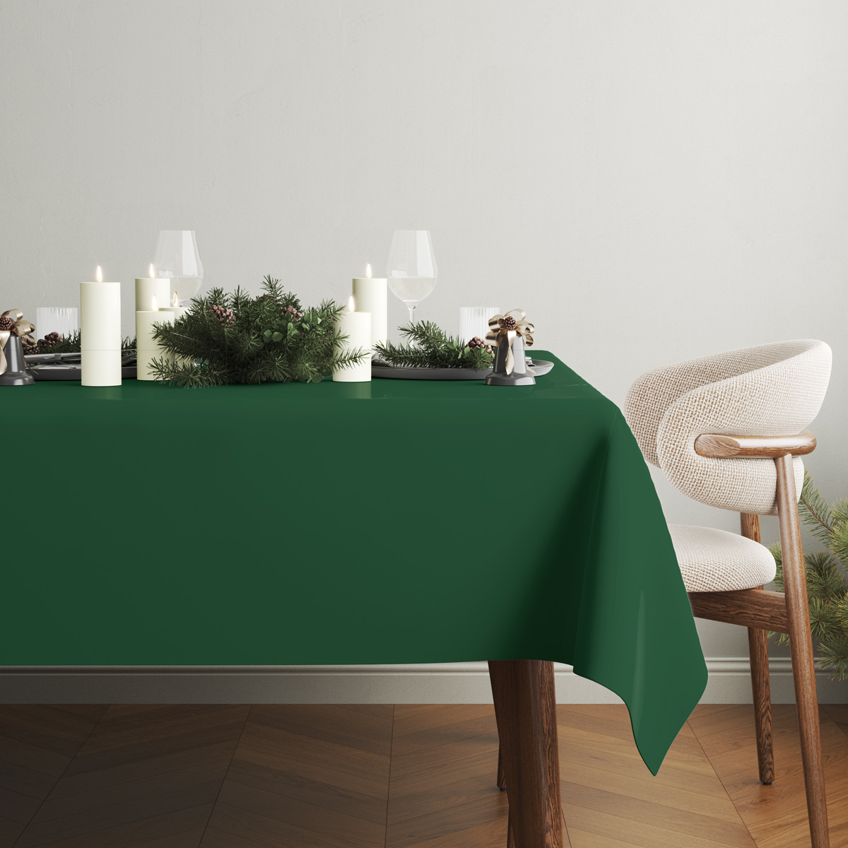 Klasyczny obrus świąteczny w eleganckim, głębokim odcieniu zieleni to idealna propozycja dla osób ceniących ponadczasowy minimalizm. Gładka tkanina pięknie układa się na stole, tworząc wyjątkowo estetyczną i spokojną aranżację świąteczną.