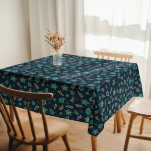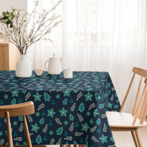 Ten efektowny obrus świąteczny w kolorze głębokiego granatu wprowadzi do Twojego wnętrza elegancję i wyjątkowy nastrój zimowych świąt. Dekoracyjny wzór z drobnymi choinkami i gałązkami w odcieniach mięty i kremu tworzy harmonijną, stylową całość. To idealny wybór dla osób, które lubią nowoczesne, a zarazem przytulne aranżacje stołu.