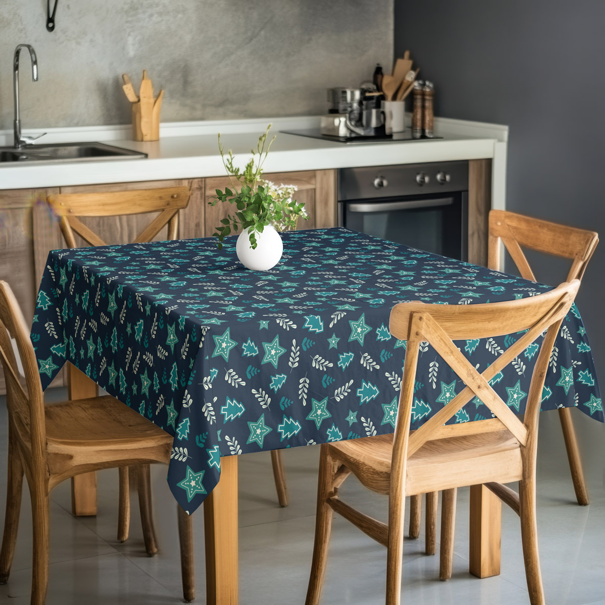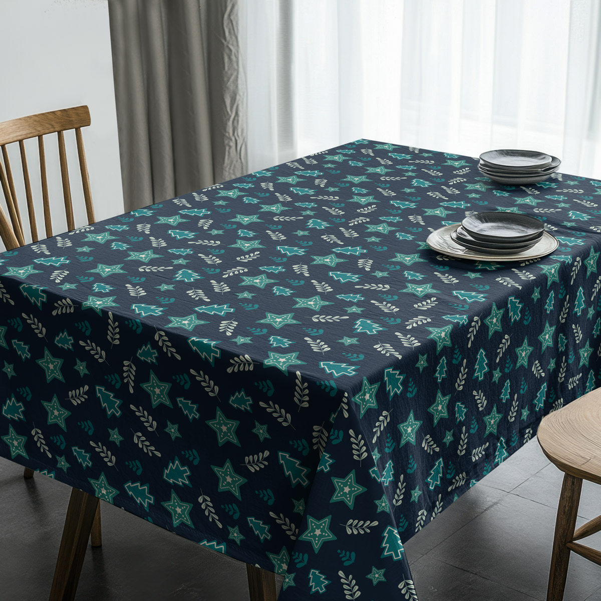 Nowoczesny obrus świąteczny w granatowym kolorze z motywem choinek, gwiazdek i gałązek. Stylowy dodatek, który nada świąteczny charakter każdemu wnętrzu.