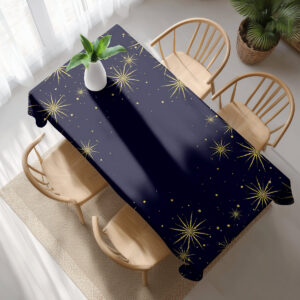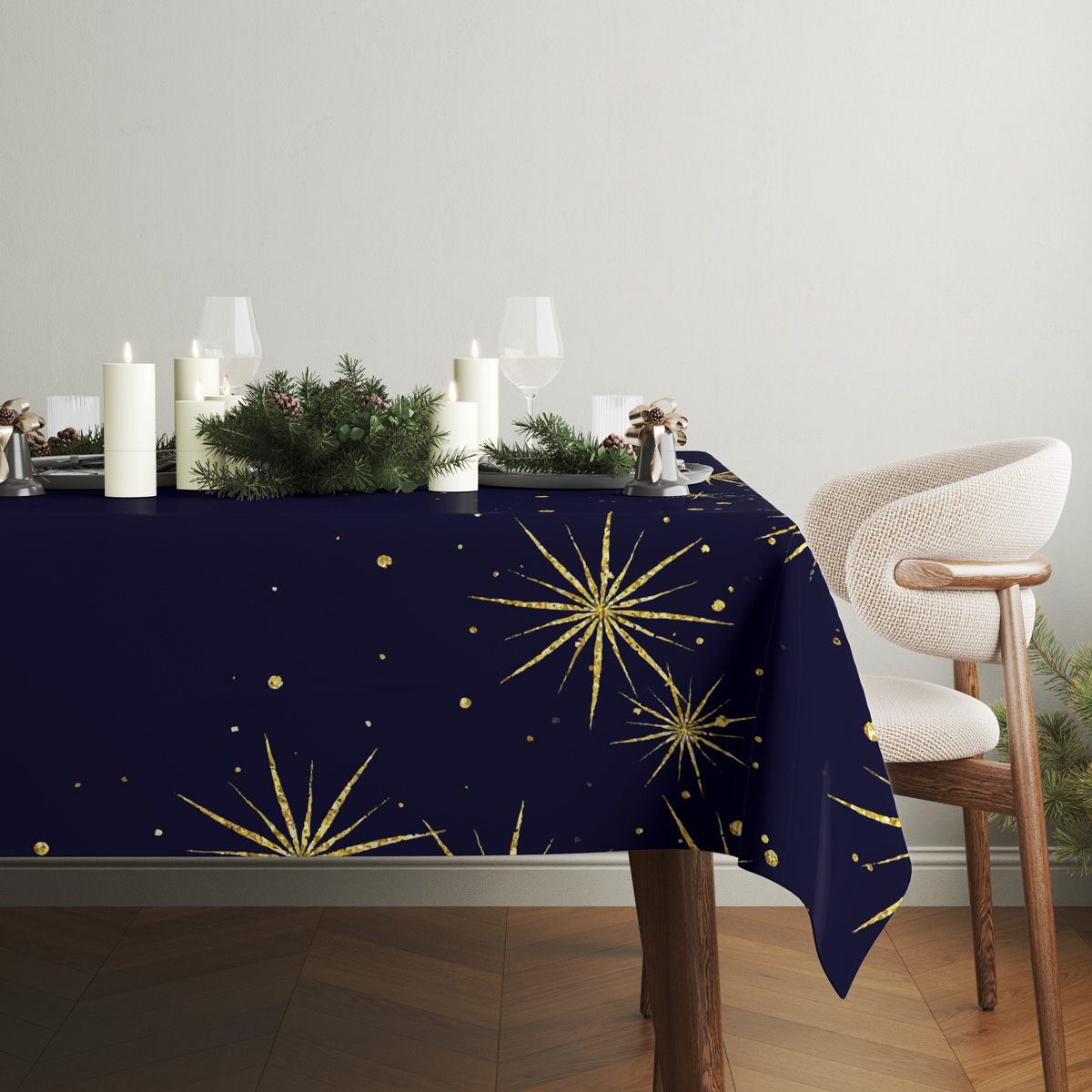 Elegancki obrus świąteczny w głębokim granatowym kolorze z motywem złotych gwiazd i iskrzących akcentów. Idealny na Boże Narodzenie i sylwestrowe przyjęcia – efektowna dekoracja stołu w nowoczesnym stylu.