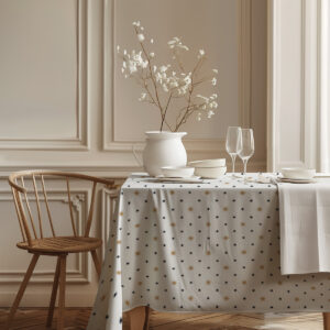 Nowoczesny obrus świąteczny w kolorze kremowym, zdobiony delikatnym wzorem złotych i granatowych gwiazdek. Subtelny, stylowy i pełen świątecznego uroku – idealny do wnętrz w stylu nowoczesnym lub skandynawskim.