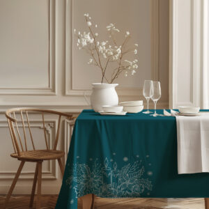 Wyjątkowy obrus świąteczny w eleganckim odcieniu morskiego błękitu, ozdobiony delikatnym białym rysunkiem przedstawiającym świąteczne świece, gwiazdki i zimowe liście. To propozycja, która łączy klasykę Bożego Narodzenia z nowoczesnym, subtelnym stylem.