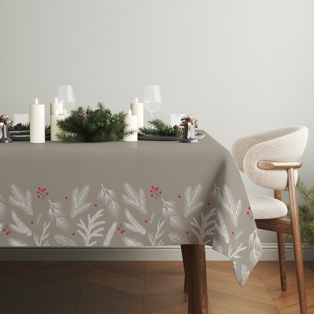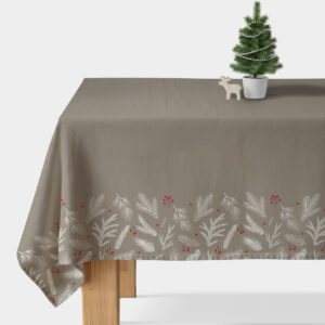 Elegancki obrus świąteczny w odcieniu taupe z subtelnym wzorem białych gałązek i czerwonych jagód. Stylowy i naturalny akcent, który doda ciepła i uroku każdemu wnętrzu w czasie Świąt.