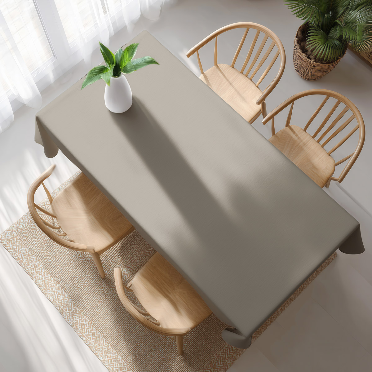 Kolor taupe w połączeniu z białymi i czerwonymi akcentami wprowadza spokój i harmonię, jednocześnie podkreślając bożonarodzeniowy charakter stołu. Obrus doskonale komponuje się z zielenią gałązek, białą zastawą i ciepłym światłem świec.