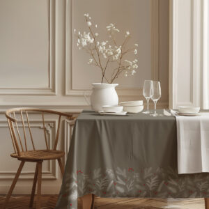 Stylowy obrus świąteczny w odcieniu taupe (ciepły beż z nutą szarości), ozdobiony delikatnym wzorem białych gałązek iglastych oraz drobnymi, czerwonymi jagodami. Naturalne barwy i subtelne detale tworzą elegancką, świąteczną kompozycję, idealną zarówno do klasycznych, jak i nowoczesnych aranżacji.