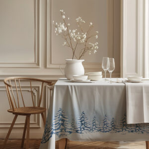 Urokliwy obrus z motywem śnieżnego lasu w błękitnych tonacjach. Wprowadza do wnętrza zimowy spokój i elegancję. Idealny na święta oraz zimowe kolacje.