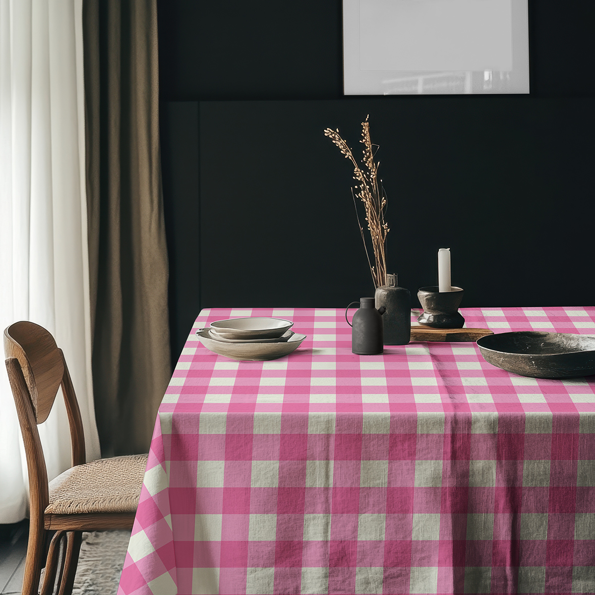 Ten obrus przyciąga wzrok dużą, równomierną kratą w intensywnym różu przeplatającym się z delikatnym kremem. Wzór dodaje wnętrzu świeżości i subtelnej energii, świetnie sprawdzając się zarówno w kuchni, jak i w jadalni.
