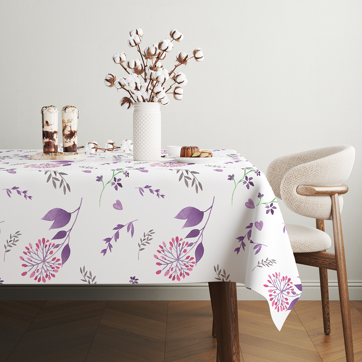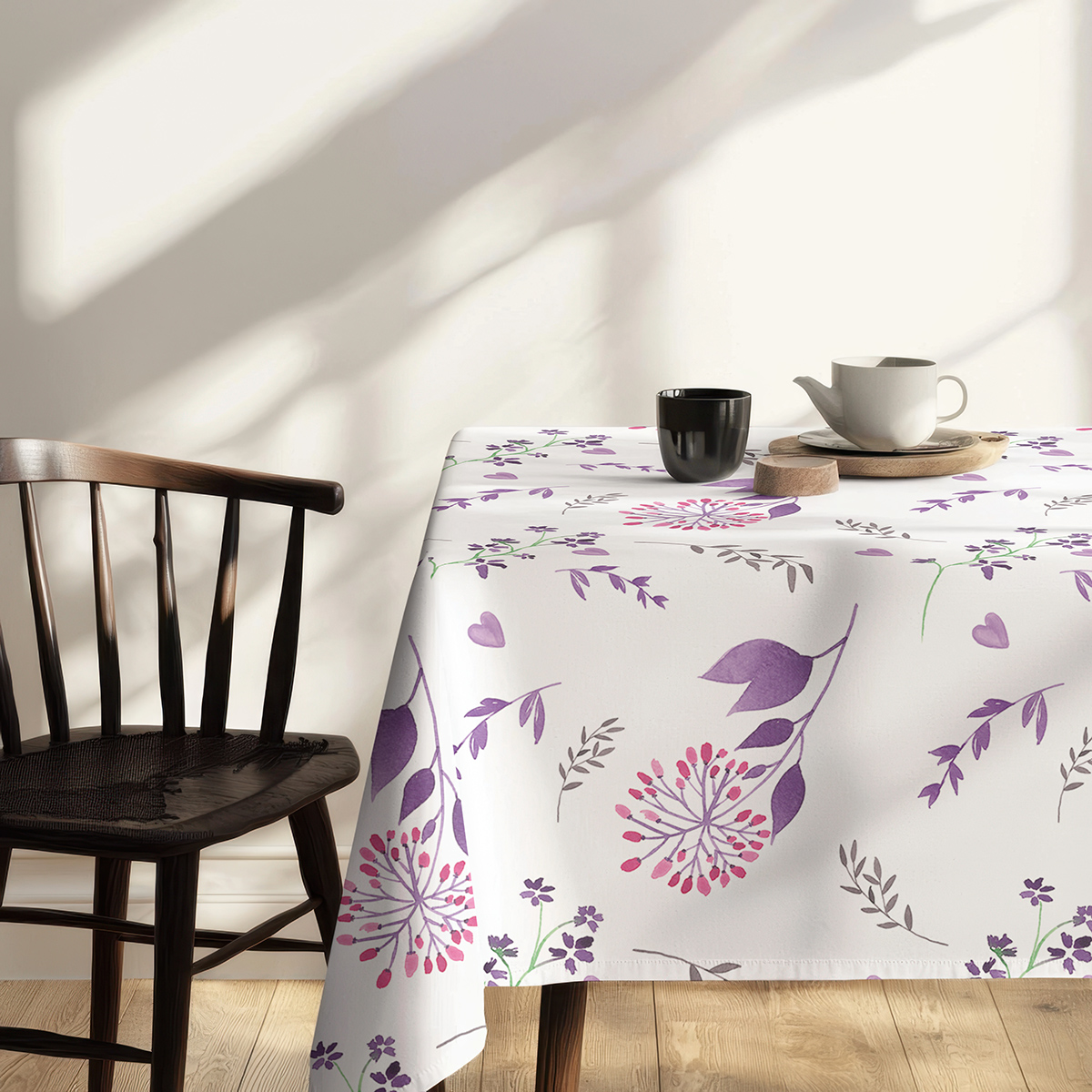 Delikatny wzór akwarelowych gałązek, drobnych kwiatków i serduszek na jasnym tle wprowadza do wnętrza świeży, romantyczny akcent. Kompozycja łączy fioletowe i różowe tonacje z subtelnymi zielonymi akcentami, dzięki czemu obrus wygląda lekko i naturalnie.