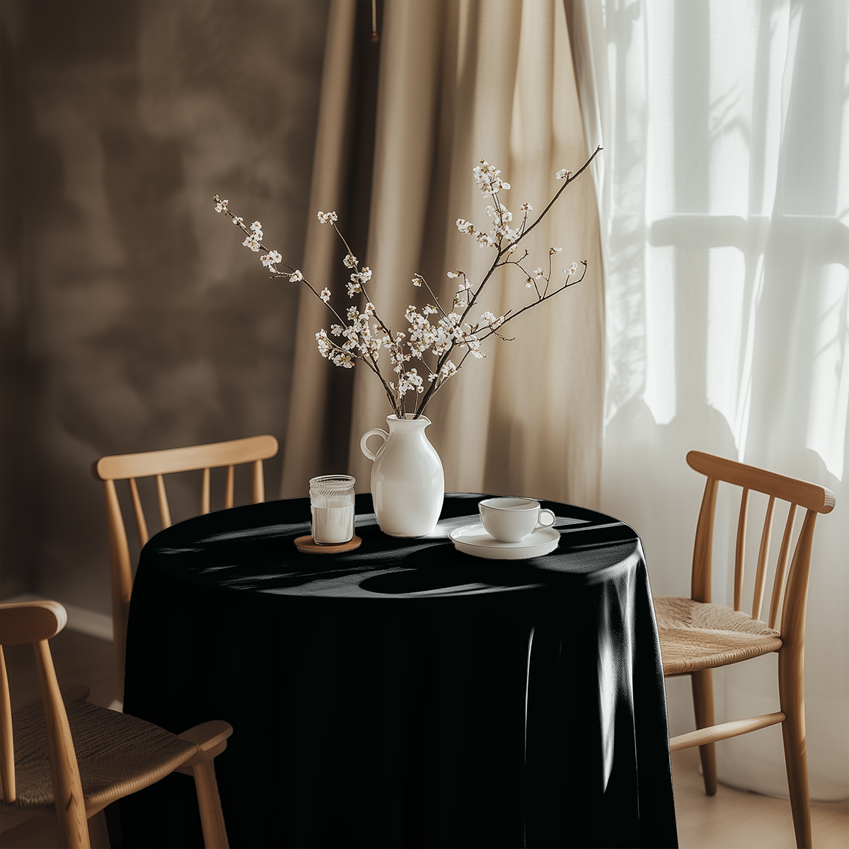 Głęboko czarny, gładki obrus okrągły doda wnętrzu elegancji i wyrazistego akcentu. Dzięki wysokiej jakości tkaninie łatwo utrzymać go w czystości, a minimalistyczny styl pasuje do różnych aranżacji.