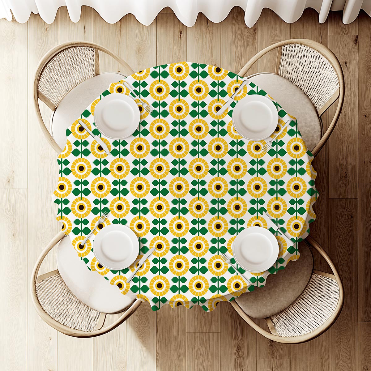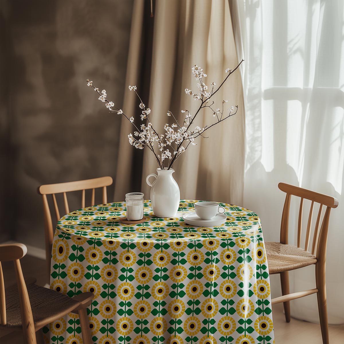 Okrągły obrus z radosnym, geometrycznym motywem słoneczników w stylu retro. Świetnie sprawdzi się w kuchni i jadalni, dodając wnętrzu ciepła i pozytywnej energii przez cały rok.