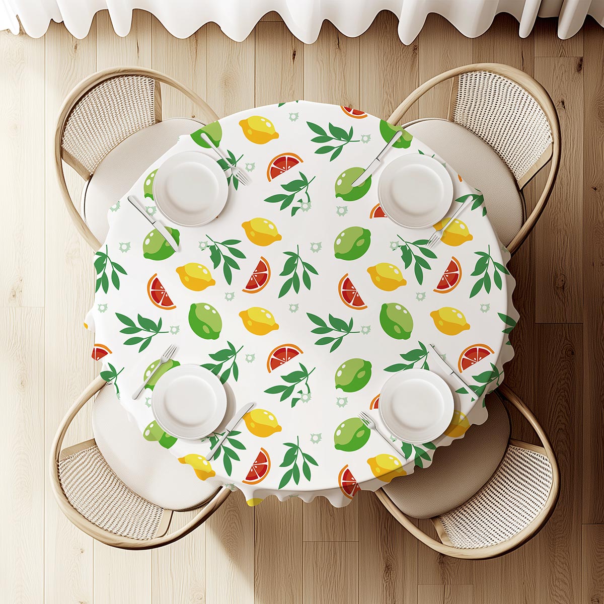 Ten obrus z nadrukiem soczystych cytrusów — limonek, cytryn i plasterków grejpfruta — oraz delikatnych zielonych listków nadaje wnętrzu świeży, radosny charakter. Jasne tło podkreśla kolory i tworzy lekki, uniwersalny motyw, który pasuje przez cały rok.