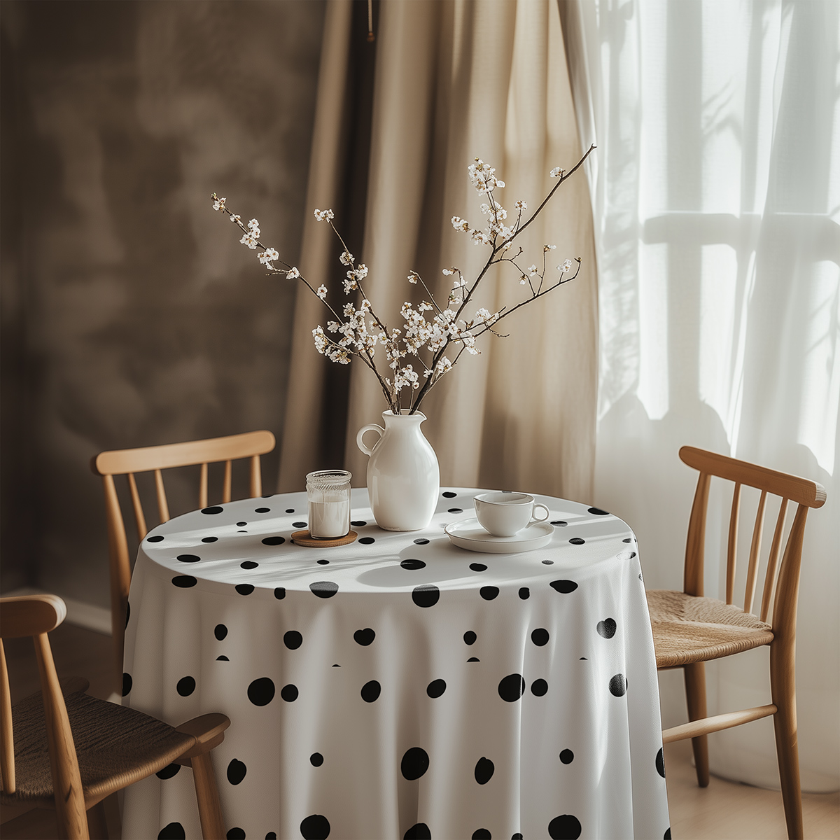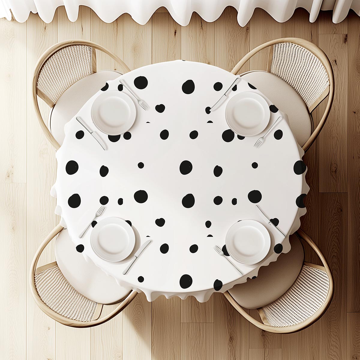 Ten dekoracyjny obrus wyróżnia się nieregularnymi, malarskimi kropkami, które tworzą lekko artystyczny i naturalny wzór. Kontrast czarnych punktów na jasnej bazie nadaje aranżacji wyrazistości, a nieregularność kropek wprowadza nieformalny, ręcznie wykonany charakter.
