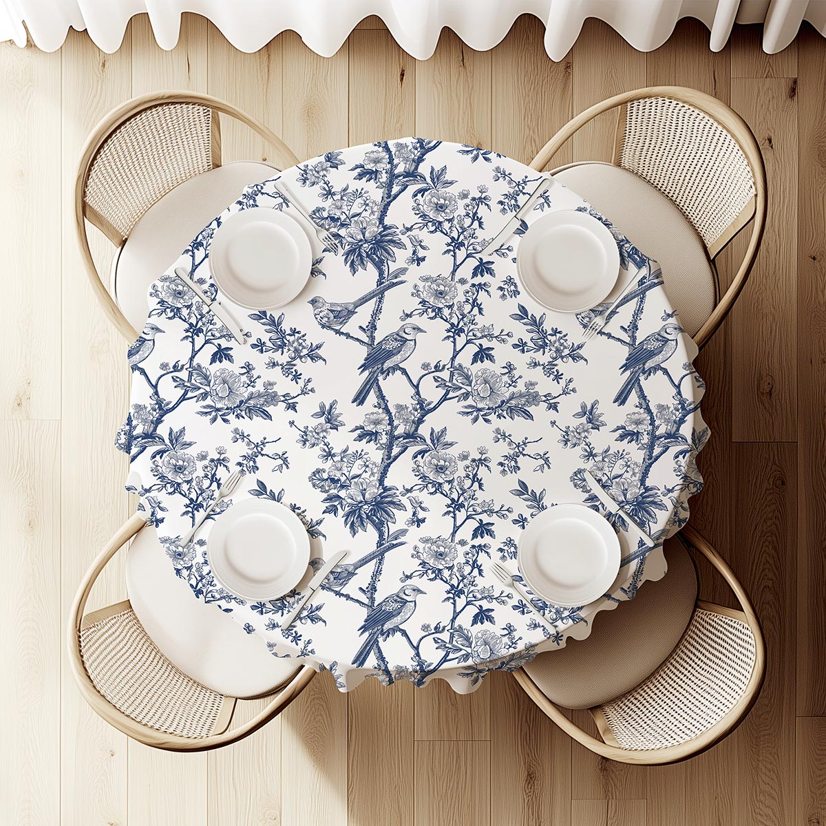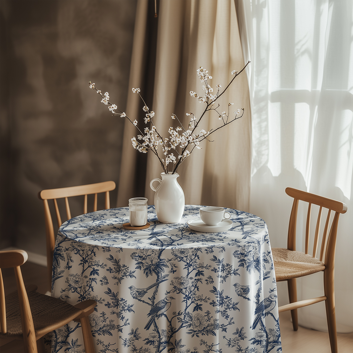 Ten obrus łączy delikatną ilustrację ptaków siedzących na gałązkach z subtelnymi kwiatowymi motywami, tworząc ponadczasowy wzór o romantycznym charakterze. Neutralne tło i wyrazisty, niebieski nadruk podkreślają detale rysunku i wprowadzają do wnętrza spokojną elegancję.