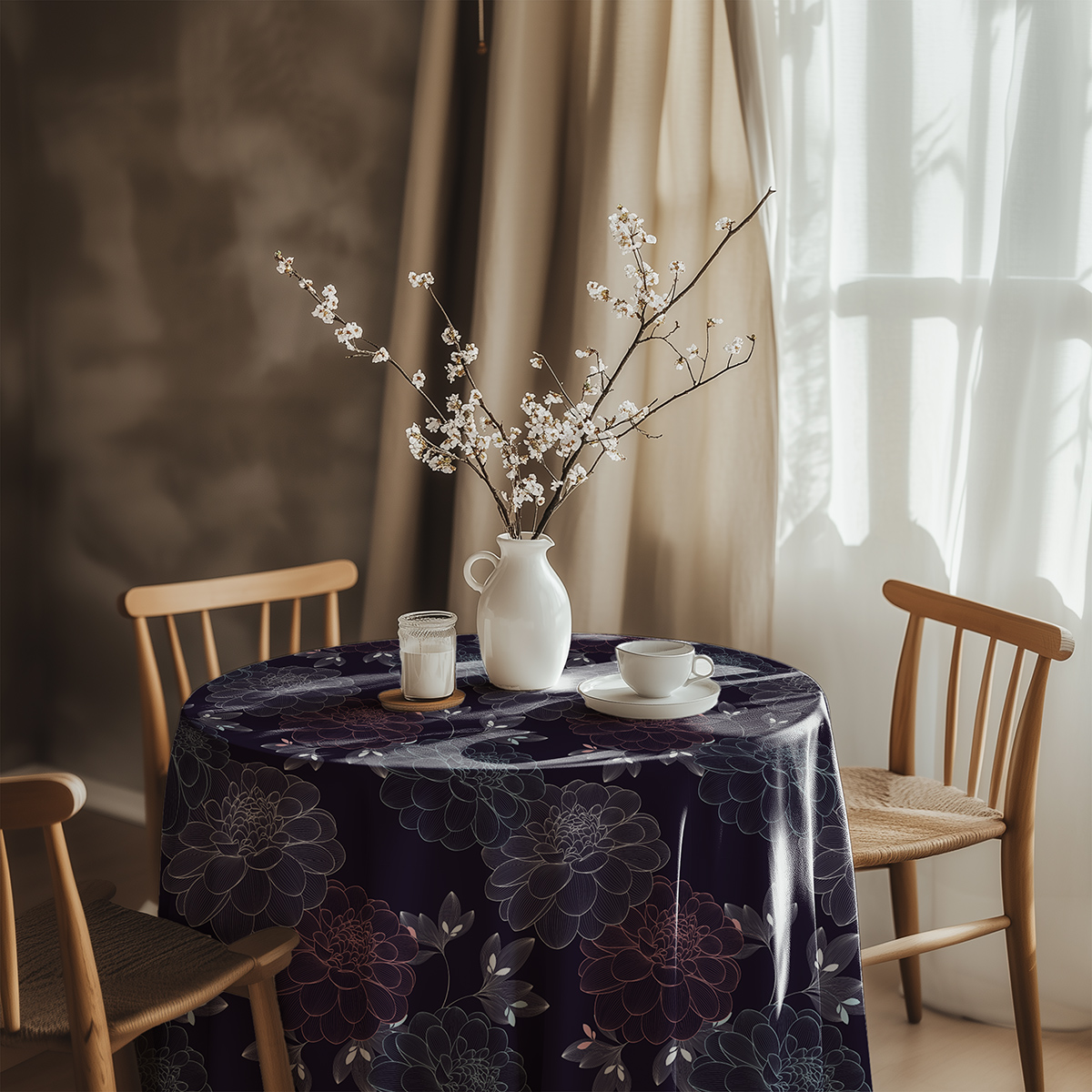 Subtelny obrus okrągły z motywem delikatnych konturów kwiatowych na głębokim granatowym tle. Dodaje stołowi elegancji i tworzy przytulną atmosferę zarówno na co dzień, jak i podczas spotkań towarzyskich.