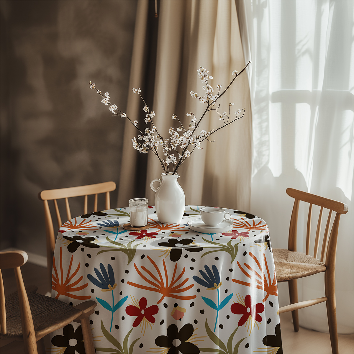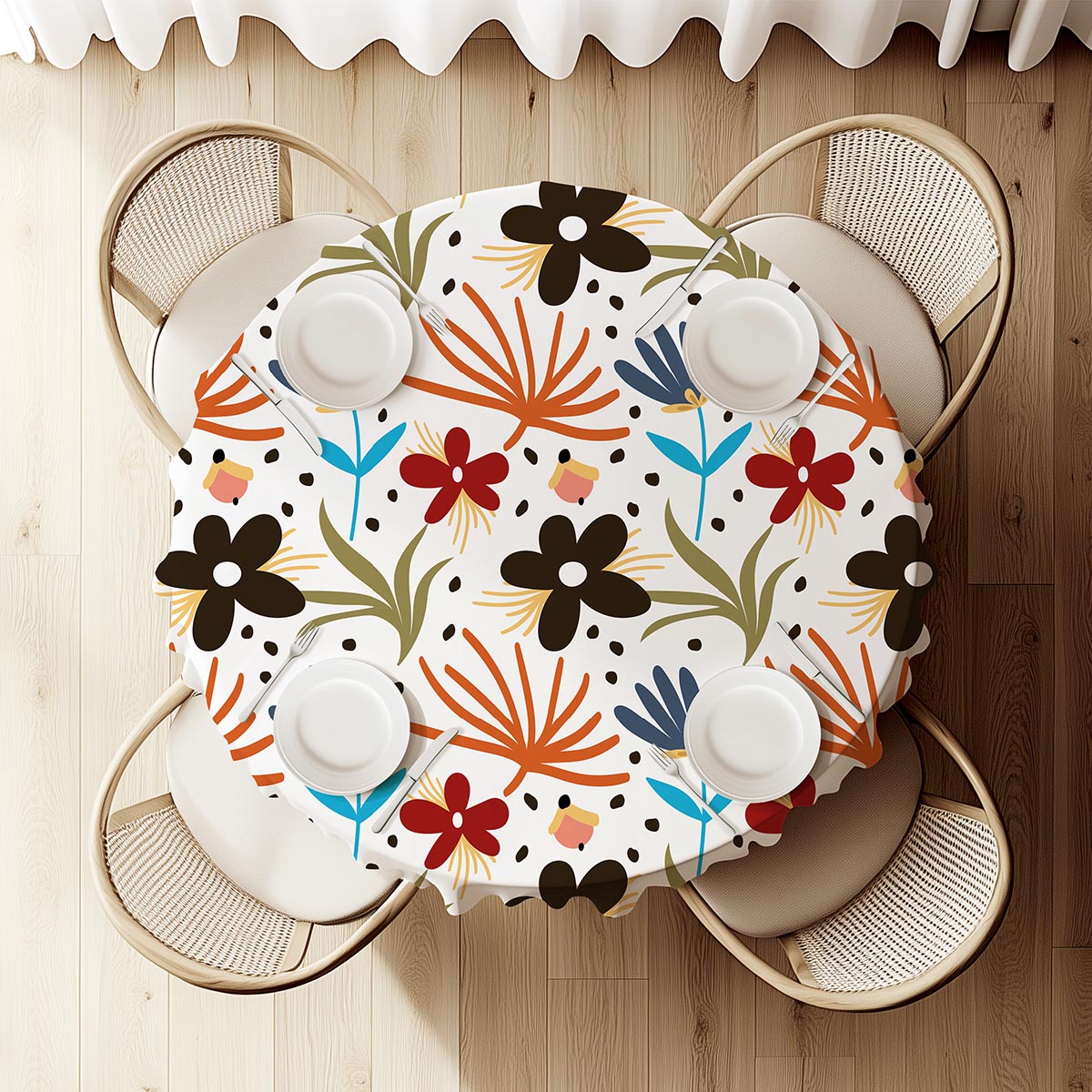 Wesoły, graficzny wzór z dużymi, uproszczonymi kwiatami i drobnymi plamkami tworzy nowoczesny, lekko folkowy charakter stołu. Kolorystyka łączy wyraziste akcenty z łagodnym tłem, dzięki czemu obrus pasuje do różnych stylów wnętrz.