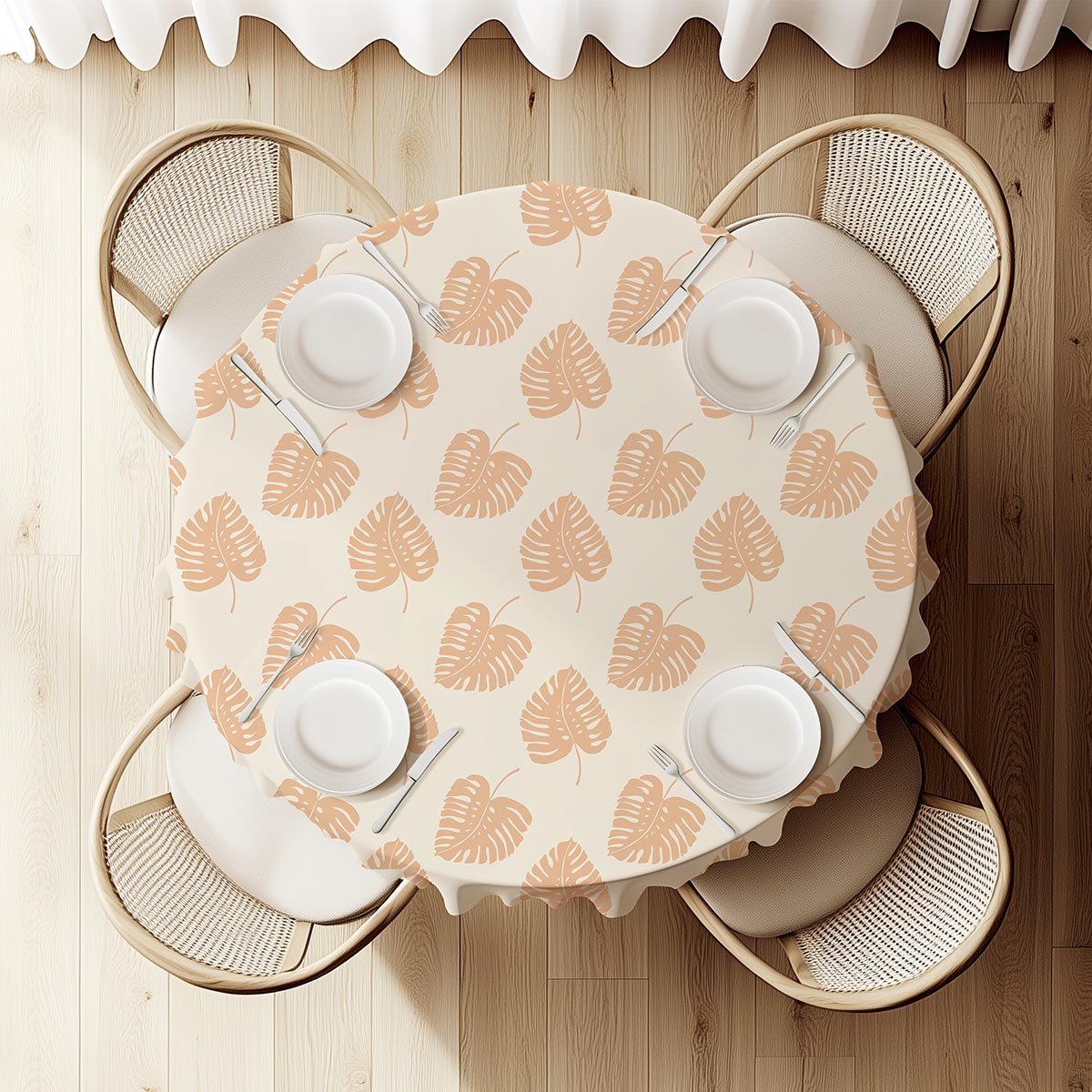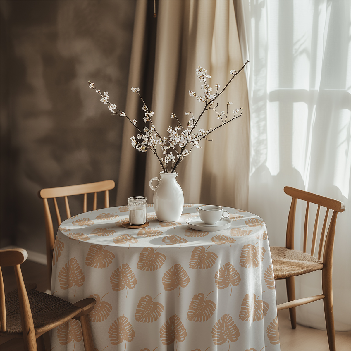 Ten okrągły obrus prezentuje rytmiczny wzór dużych liści na gładkim tle, który wnosi do wnętrza naturalną, spokojną atmosferę. Subtelna kolorystyka i regularny układ wzoru sprawiają, że obrus wygląda elegancko, a jednocześnie przytulnie.
