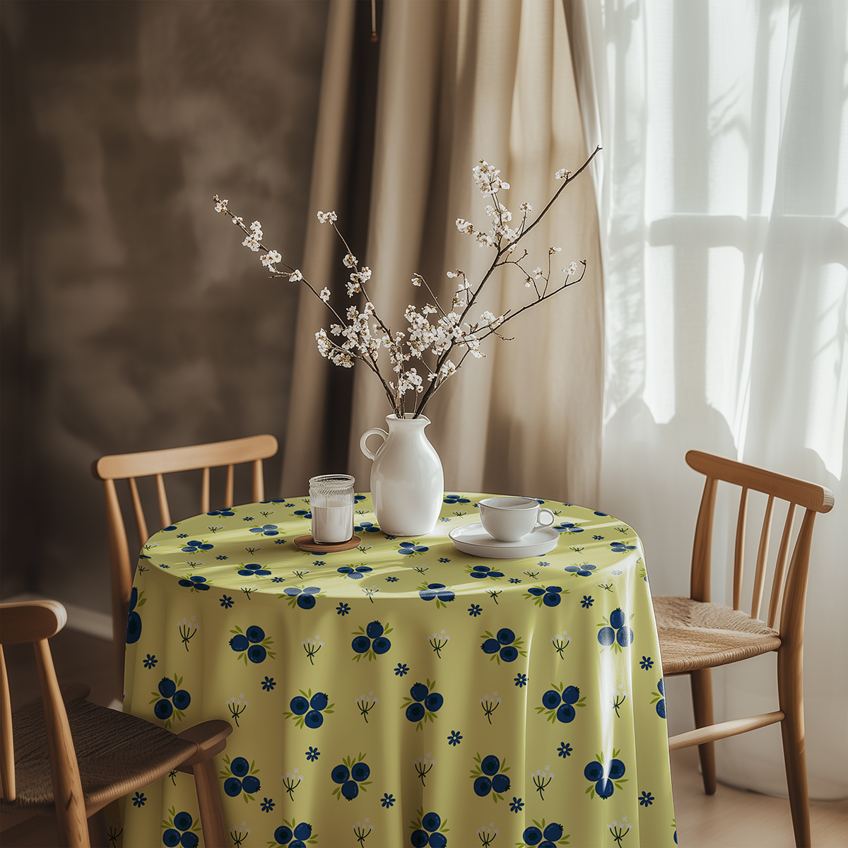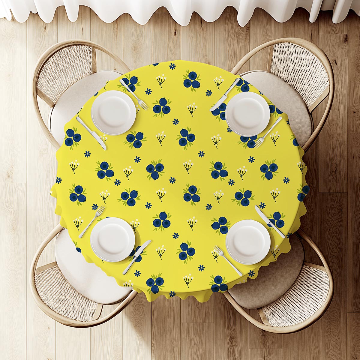 Cytrynowe tło z drobnymi granatowymi jagódkami wnosi do wnętrza świeży, energetyczny akcent. Okrągły obrus świetnie nadaje się do codziennego użytku i stylowych aranżacji stołu.