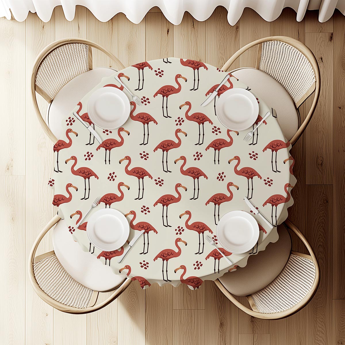 Okrągły obrus z delikatnym kremowym tłem i wzorem różowych flamingów doda stołowi świeżości i charakteru. Idealny na codzienne posiłki oraz małe przyjęcia, łatwy w utrzymaniu czystości.