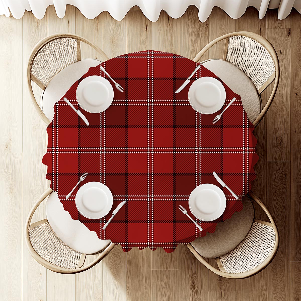 Okrągły obrus prezentuje intensywną czerwień przełamaną czarnymi i białymi liniami, tworząc ponadczasowy, szkocki motyw. Ten wzór wprowadza do wnętrza ciepłą, tradycyjną atmosferę, która pasuje do różnych stylów — od rustykalnego po nowoczesny. Materiał jest przyjemny w dotyku i odporny na codzienne użytkowanie, dzięki czemu zachowuje kolor i kształt po praniu.