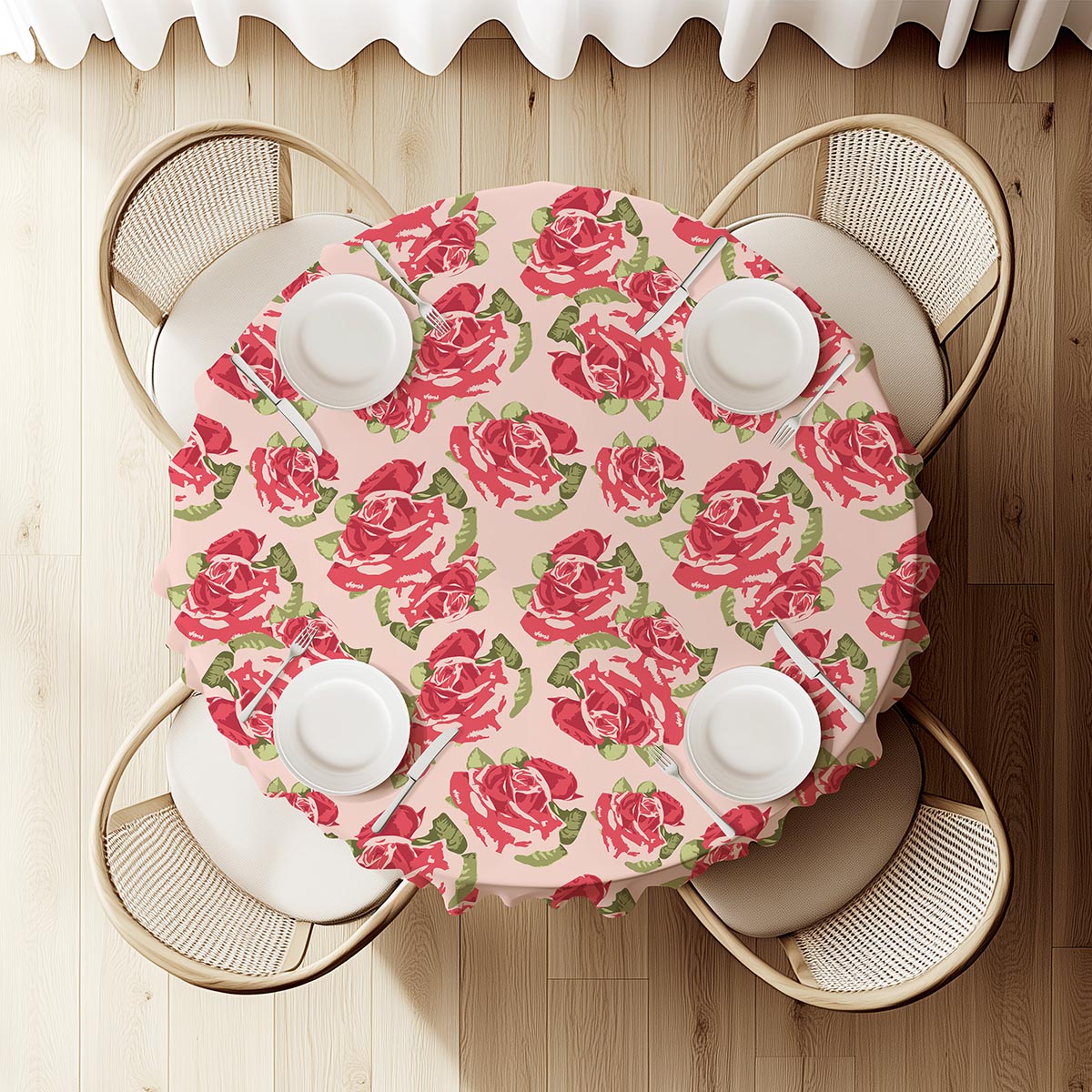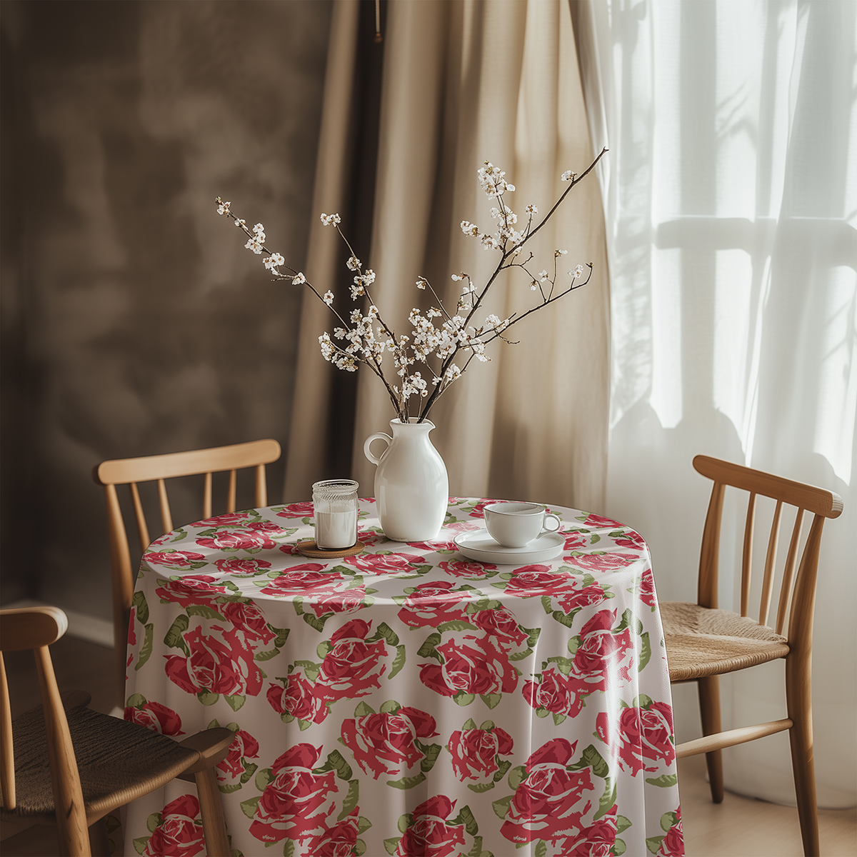 Romantyczny obrus okrągły z dużymi, malowanymi różami na delikatnym pudrowym tle. Doskonale sprawdzi się przy codziennych posiłkach i uroczystych okazjach, wprowadzając do wnętrza subtelny, kwiatowy akcent.
