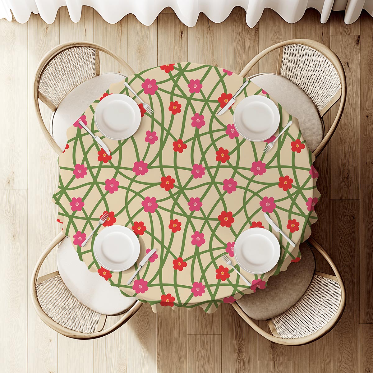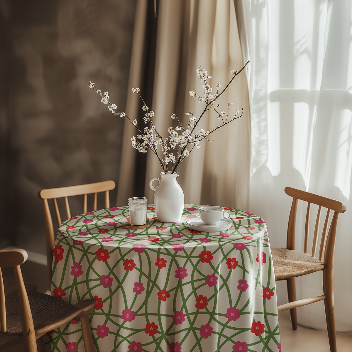 Okrągły obrus na beżowym tle z delikatną, zieloną siatką pnączy i radosnymi różowo-czerwonymi kwiatuszkami. Doda wnętrzu ciepła i lekkości, sprawdzając się na co dzień i przy małych przyjęciach.