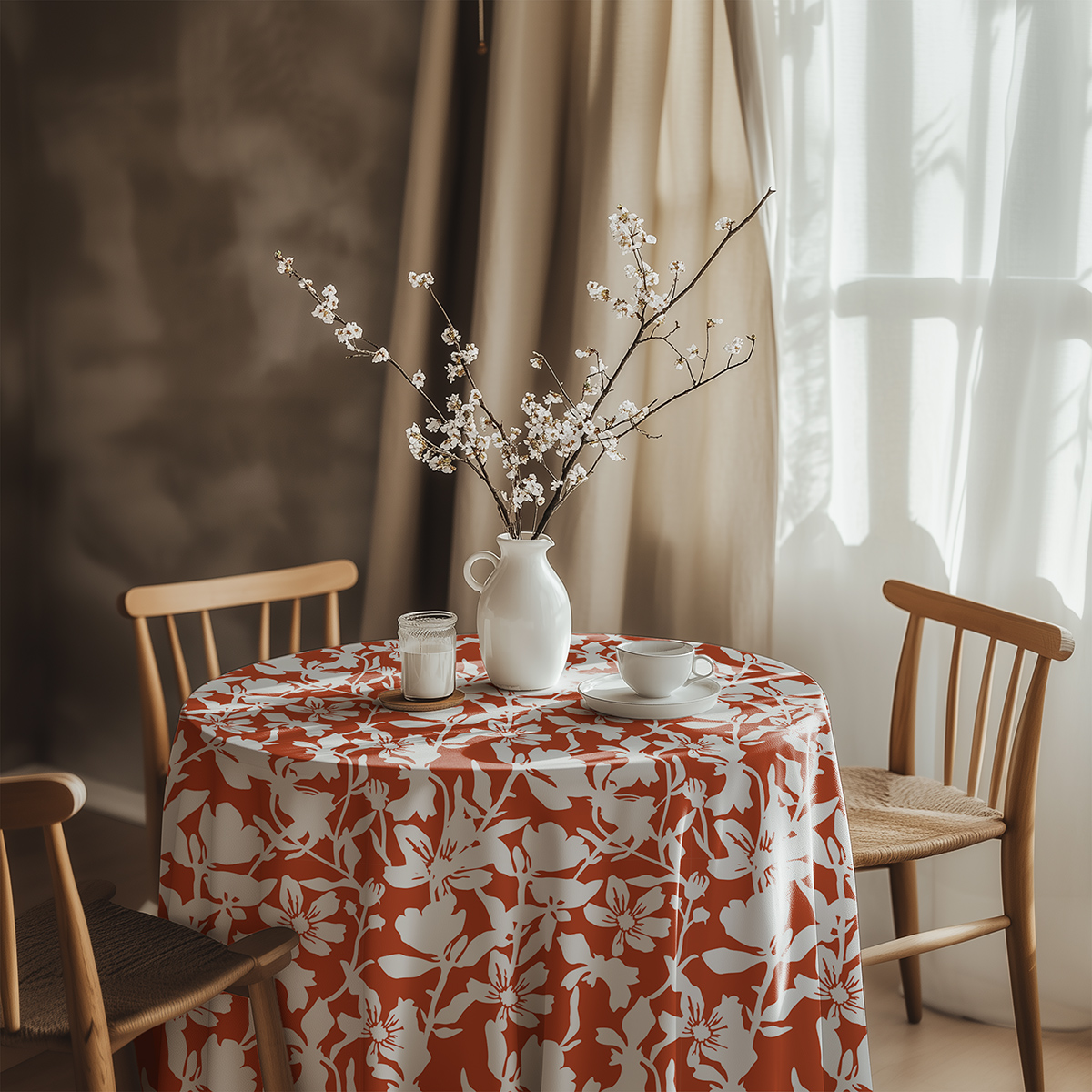 Ten obrus łączy wyrazisty, biały wzór florystyczny z głębokim, ceglastym tłem, tworząc harmonijną i stylową kompozycję. Kontrastowe kwiaty nadają aranżacji lekko artystycznego charakteru, który ożywia zarówno nowoczesne, jak i klasyczne wnętrza.