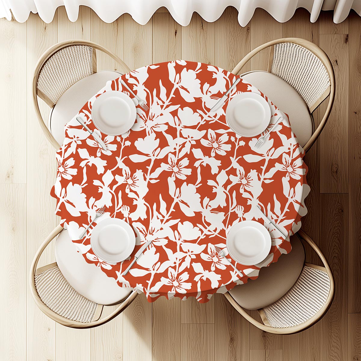 Okrągły obrus z dekoracyjnym, białym motywem kwiatowym na ciepłym ceglastym tle doda wnętrzu przytulnego charakteru. Sprawdzi się zarówno przy codziennym stole, jak i podczas domowych spotkań dzięki trwałemu materiałowi i łatwej pielęgnacji.