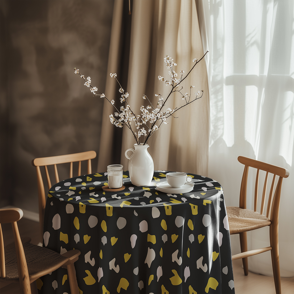 Ten obrus prezentuje nowoczesny motyw terrazzo z organicznymi, nieregularnymi plamami w musztardowych i pudrowych odcieniach na grafitowym tle. Subtelne kontrasty kolorystyczne tworzą ciekawy, ale stonowany wzór, który urozmaici jadalnię, kuchnię lub mały stolik kawowy.