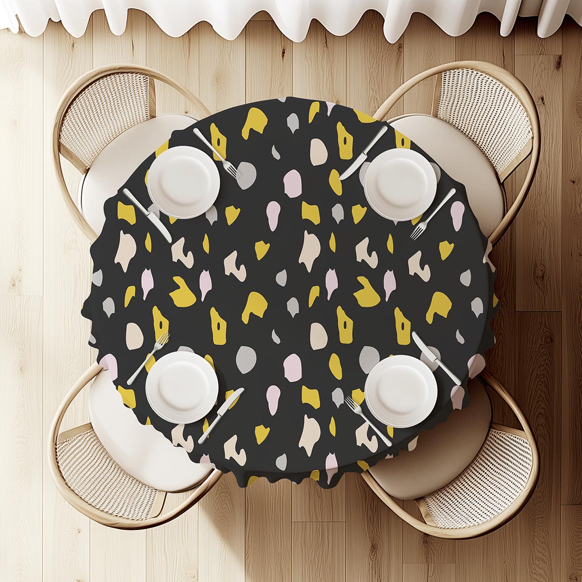 Okrągły obrus na stół na wymiar – grafitowy terrazzo z musztardowymi i pudrowymi plamami
