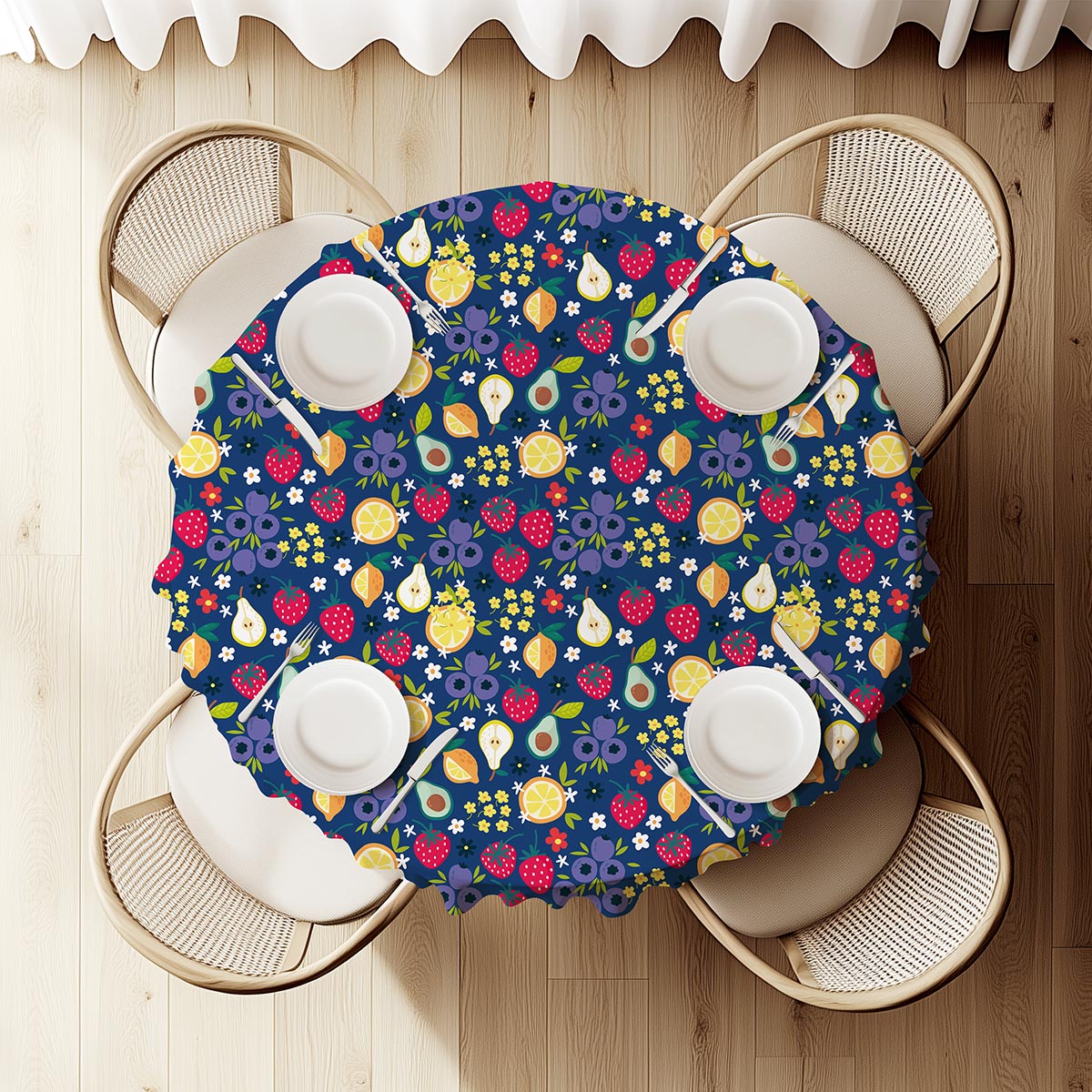 Kolorowy okrągły obrus z motywem truskawek, cytryn, gruszek, jagód i awokado doda energii każdemu stołowi. Granatowe tło podkreśla wyraziste wzory i pasuje do wnętrz w różnych stylach.